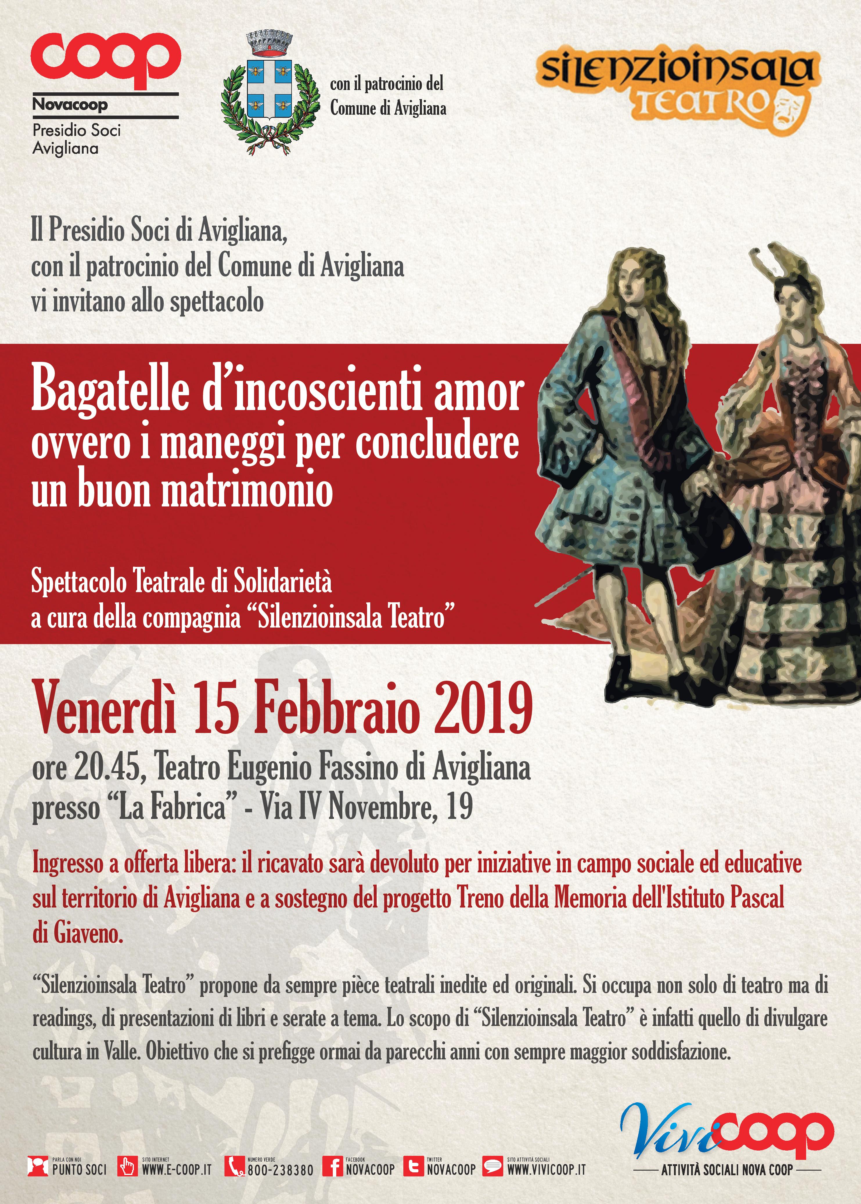 “Bagatelle d’incoscienti amor, ovvero i maneggi per concludere un buon matrimonio” è lo spettacolo teatrale di solidarietà, promosso dal presidio soci Coop di Avigliana, con il patrocinio del Comune di Avigliana a cura della compagnia “Silenziosità teatro”, che va in scena al Teatro Eugenio Fassino di Avigliana venerdì 15 febbraio 2019 alle ore 20,45. L’ingresso è a offerta libera e il ricavato sarà devoluto in iniziative in campo sociale ed educativo, per progetti legati alle scuole di Avigliana e Giaveno.