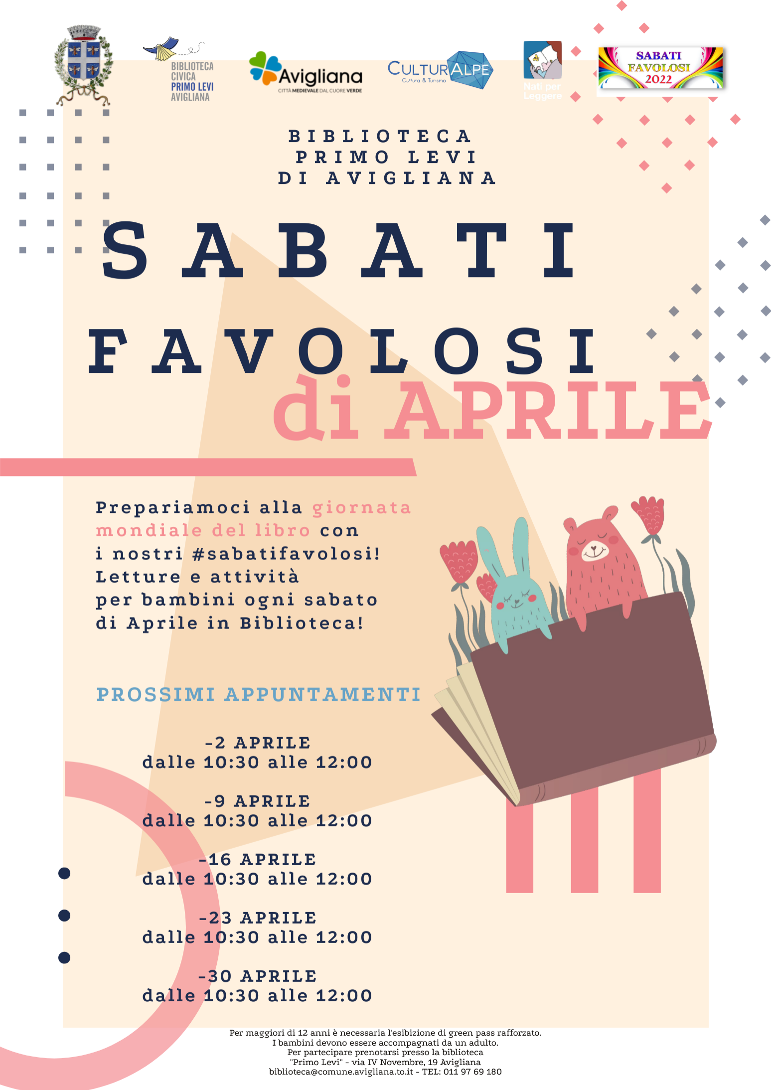 Aprile è un mese fortunato perché sono cinque i sabati favolosi: il 2, il 9, il 16, il 23 e il 30. Dalle 10,30 alle 12 di ogni sabato in biblioteca si terranno letture e attività per bambini. L’ingresso per gli over 12 è con super Green pass e dispositivi di protezione Ffp2. Per partecipare occorre prenotarsi in biblioteca: biblioteca@comune.avigliana.to.it, telefono 011.9769180.