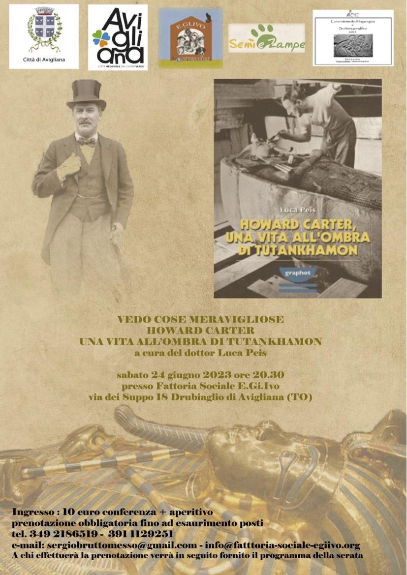 Avigliana, 20 giugno 2023 – “Vedo cose meravigliose” è il titolo della serata organizzata dalla fattoria sociale Egiivo con il patrocinio del Comune di Avigliana per sabato 24 giugno 2023 a partire dalle 20,30. Il relatore Luca Peis, autore del libro “Howard carter, una vita all’ombra di Tutankhamon” edito da Graphot cercherà di rispondere alle domande che in molti si sono fatti sul famoso archeologo a cent’anni dalla sua impresa: sappiamo chi fu veramente Howard Carter? Perché il suo Paese non gli attribuì alcuna onorificenza o laurea e al suo funerale furono presenti solo sei persone? Le risposte a queste domande sono nella vita dell’uomo la cui fama fu offuscata dal faraone. Appuntamento dunque in via dei Suppo 18 Drubiaglio di Avigliana per sabato 24 giugno alle 20,30.
