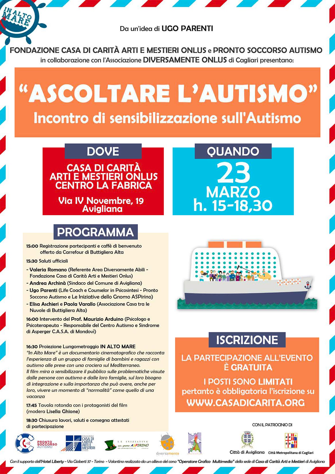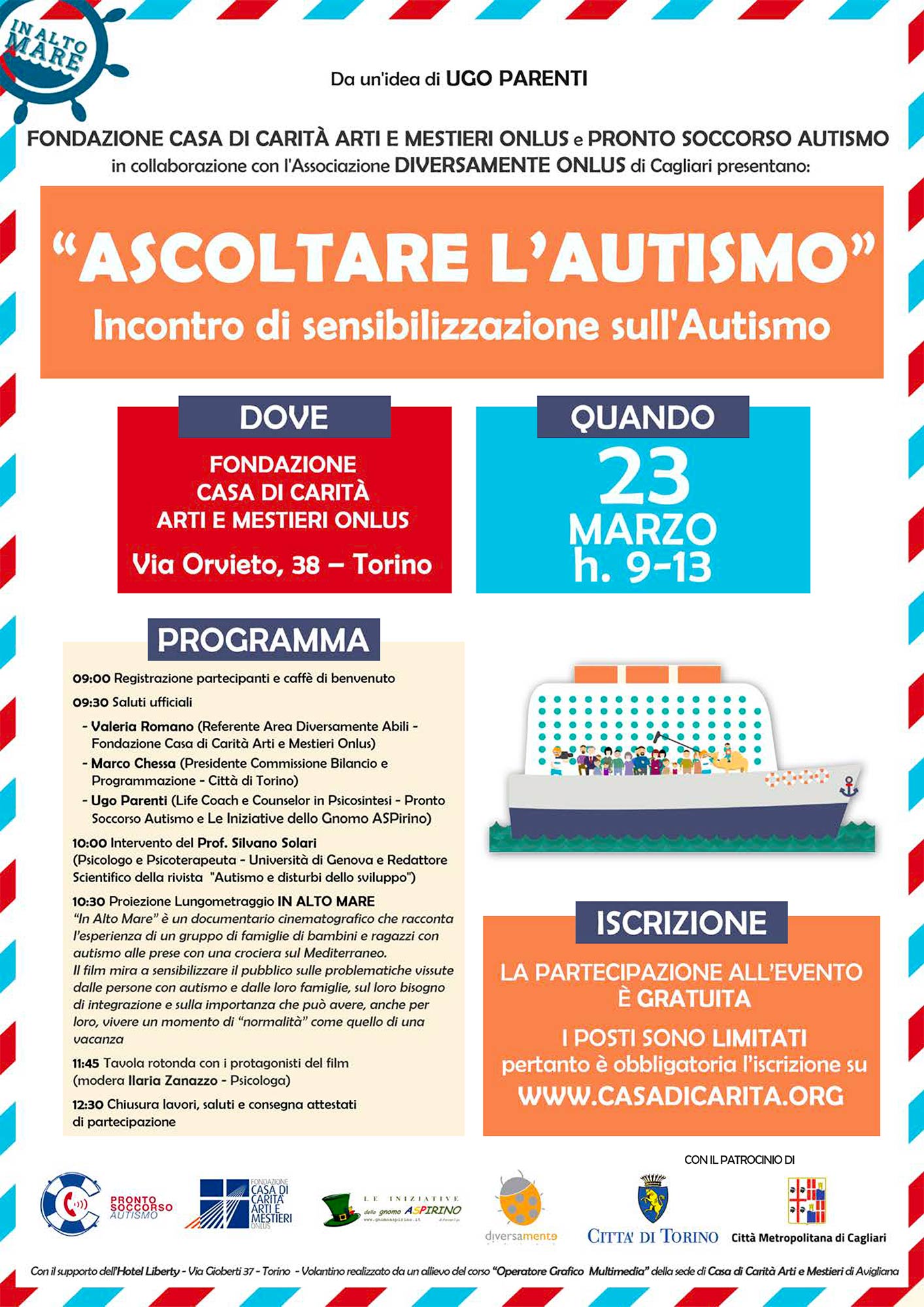 Fondazione Casa di Carità Arti e Mestieri onlus, in collaborazione con Pronto Soccorso Autismo e con l’Associazione Diversamente Onlus di Cagliari, presenta l’evento di sensibilizzazione “Ascoltare l’Autismo”, che si svolgerà sabato 23 marzo, al mattino presso la sede di Torino e nel pomeriggio presso la sede di Avigliana.