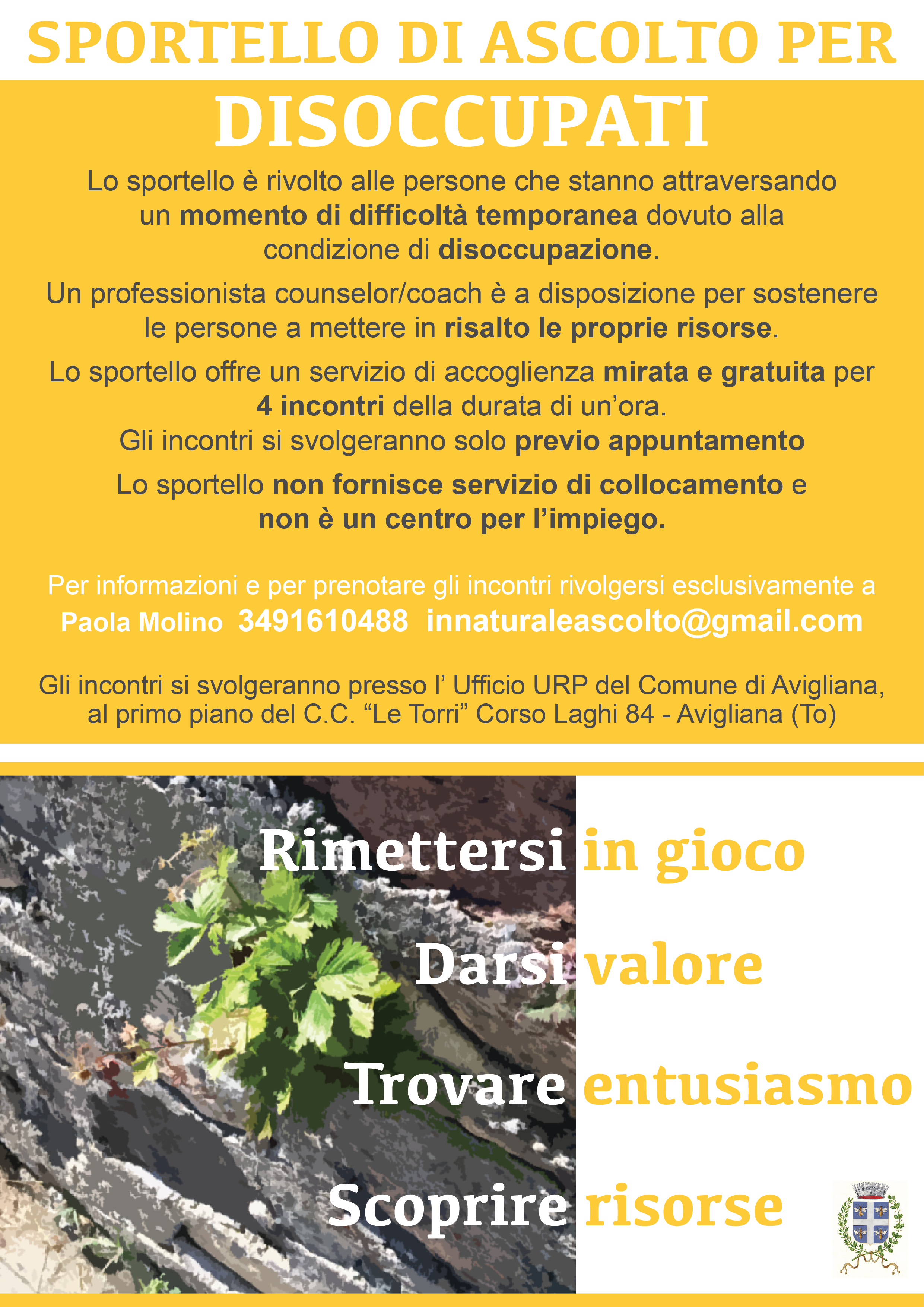 Ad Avigliana nasce il progetto Sportello di ascolto per i disoccupati: 4 incontri di un’ora per mettere in risalto le proprie risorse a partire dal 16 ottobre