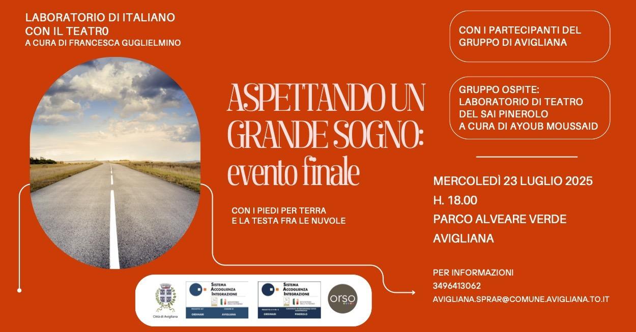 Avigliana, 16 luglio 2025 – Mercoledì 23 luglio alle 18 al parco Alveare verde si terrà l’evento conclusivo del laboratorio di Italiano con il teatro a cura di Francesca Guglielmino, nell’ambito del progetto di accoglienza e integrazione Sai. Parteciperanno con una piccola performance i componenti del gruppo di Avigliana e il gruppo ospite del laboratorio di teatro del Sai Pinerolo a cura di Ayoub Moussaid, con cui è recentemente nata una collaborazione sulla sperimentazione del teatro come strumento di integrazione e partecipazione attiva dei beneficiari accolti nei progetti di accoglienza.