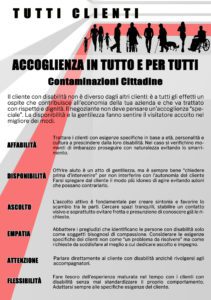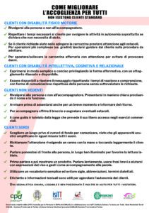 • accogliere e servire target di clienti attraverso semplici indicazioni utili a migliorare la relazione, con particolare attenzione ai clienti sordi, ciechi, con disabilità fisico motorie, con disabilità intellettive, cognitive e relazionali.