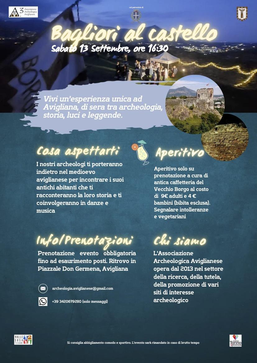 Avigliana, 28 agosto 2025 – Bagliori al Castello è un evento unico e affascinante che sabato 13 settembre porterà i partecipanti in un viaggio serale nella Storia della città e delle antiche rovine del Castello. Lo presentano l’Associazione archeologica aviglianese A3, in collaborazione con il Gruppo storico Borgo Vecchio, l’associazione Volo silenzioso e con il patrocinio della Città di Avigliana e del progetto Valle Susa Tesori.
