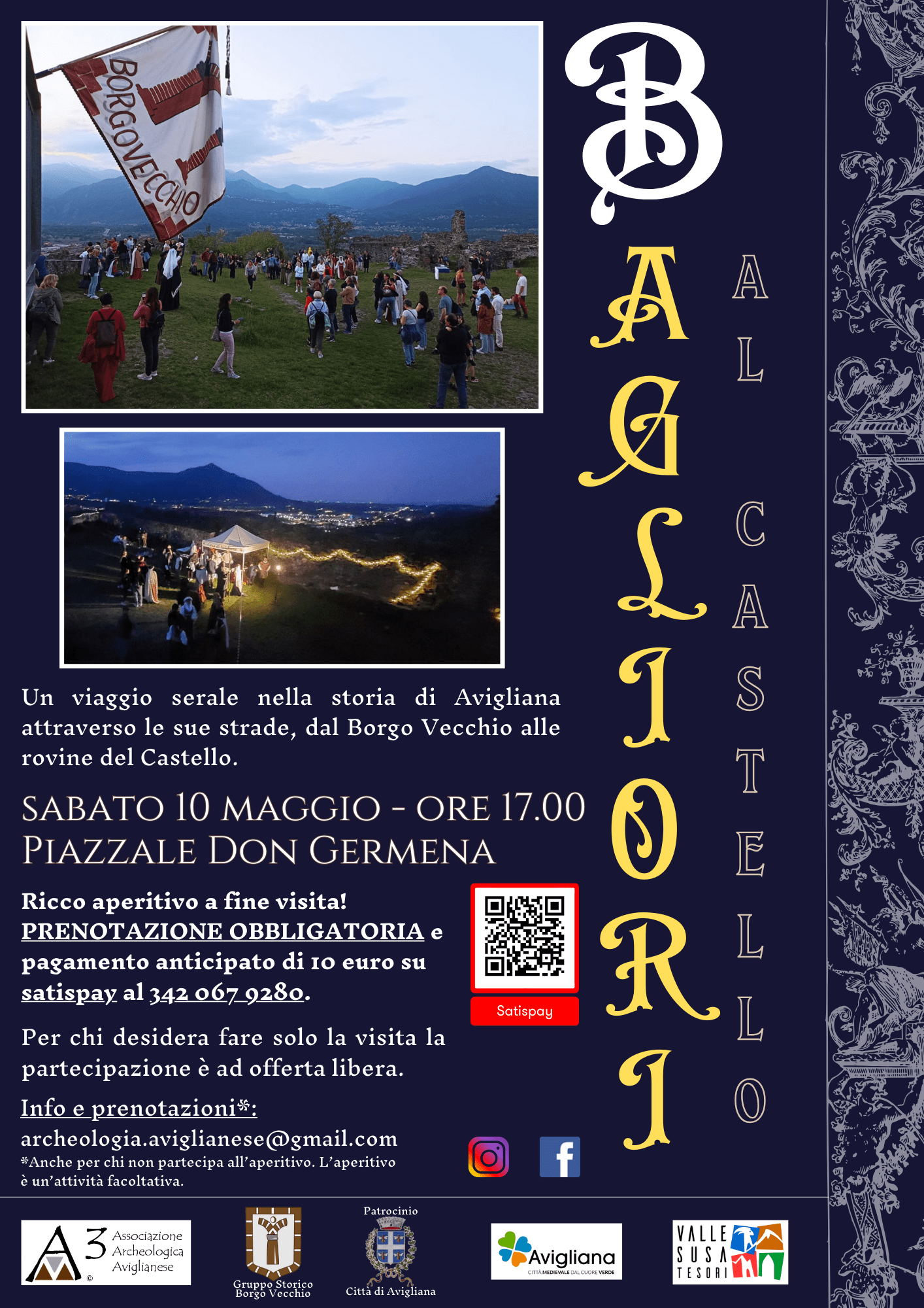 Un’esperienza immersiva tra luci, storia e natura. I visitatori saranno accompagnati in un percorso guidato tra le strade storiche di Avigliana, arricchito da racconti, scenografie e momenti evocativi che culmineranno tra le suggestive rovine del Castello al tramonto. Una camminata tra passato e presente, pensata per coinvolgere i sensi e accendere la curiosità verso la Storia locale. Al termine della visita è previsto un ricco aperitivo in un contesto panoramico e conviviale. Per partecipare all’aperitivo è obbligatoria la prenotazione e il pagamento anticipato di 10 euro tramite Satispay al numero 342 067 9280.