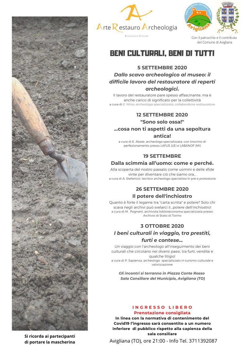 Un ciclo di 5 incontri e conferenze sul tema dei beni culturali organizzati da Ara, Arte restauro archeologia con il patrocinio e il contributo del Comune di Avigliana il 5, 12, 19, 26 settembre e 3 ottobre 2020