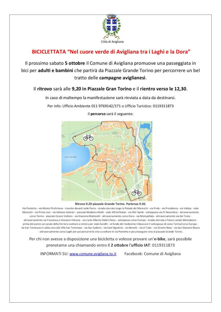 Sabato 5 ottobre il Comune di Avigliana promuove una passeggiata in bici per adulti e bambini che partirà da piazzale Grande Torino per percorrere un bel tratto delle campagne aviglianesi tra i laghi e la Dora