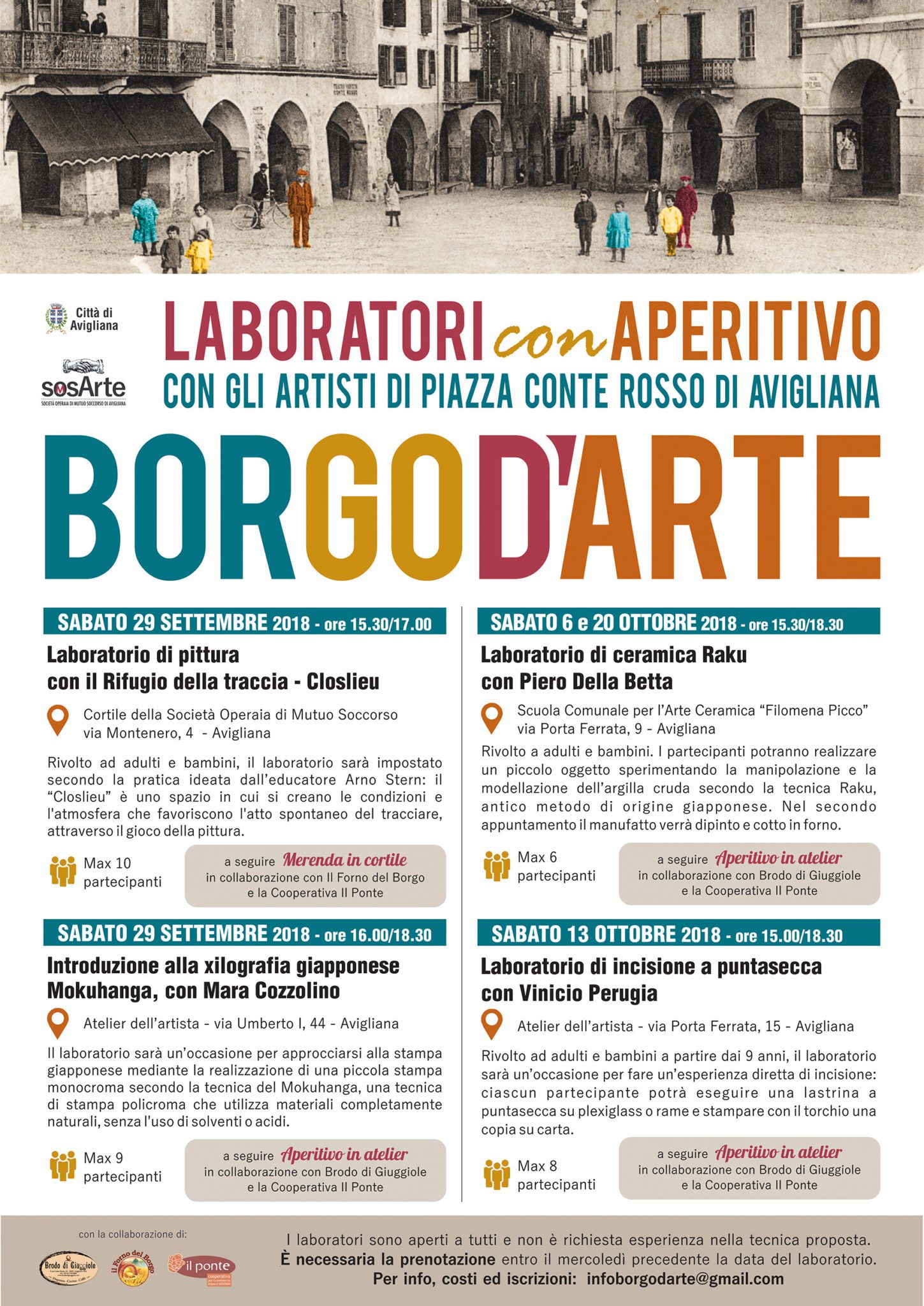 È necessaria la prenotazione entro il mercoledì precedente il laboratorio. Per info, costi e prenotazioni inviare mail a infoborgodarte@gmail.com.