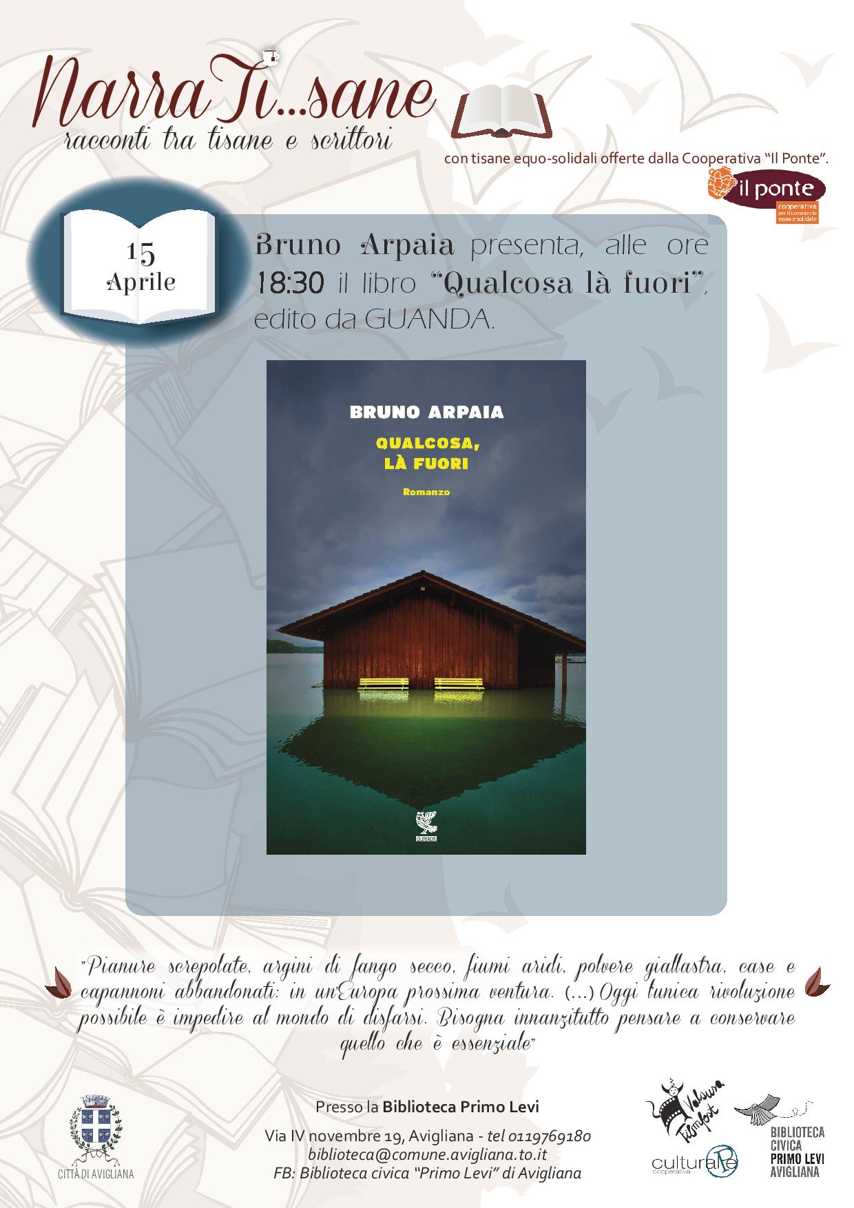 Il modello di Narra Ti…sane è ormai collaudato: un autore presenta un libro e il pubblico in sala può rilassarsi con tisane equo-solidali offerte dalla Cooperativa “Il Ponte”. Il 15 aprile 2019 toccherà a Bruno Arpaia raccontare il suo nuovo romanzo “Qualcosa là fuori”, per le ricercate edizioni Guanda. La serata è organizzata da Culturalpe ed è stata inserita nell’ambito degli incontri culturali del Valsusa Filmfest con il patrocinio della Città di Avigliana.