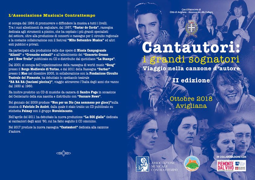 La seconda edizione della Rassegna “Cantautori: i grandi sognatori” ha preso il via sabato 6 ottobre presso l’Auditorium “Daniele Bertotto” via Cavalieri di Vittorio Veneto 3 (piazza del Popolo) ad Avigliana. È realizzata dall’associazione musicale Contrattempo, in collaborazione con il Civico istituto musicale “Sandro Fuga” con il contributo di Piemonte dal Vivo e Comune di Avigliana. L’appuntamento di chiusura della manifestazione è per il 27 ottobre con Carlo Pestelli, uno dei più interessanti cantautori italiani che presenterà in anteprima il suo nuovo lavoro discografico dal titolo “Aperto per ferie”.