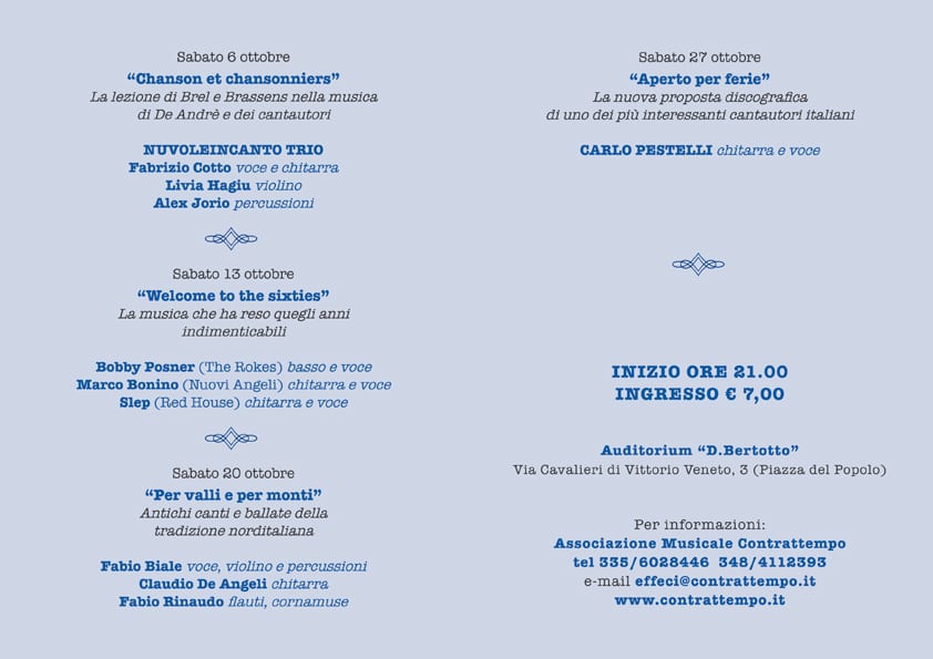 Il primo appuntamento è stato dedicato al trio formato da Fabrizio Cotto, Livia Hagiu e Alex Jorio nello spettacolo “Chanson et chansonniers”, sull’influenza che hanno avuto Brassens e Brel sui cantautori italiani a partire dall’inizio degli anni ‘60. Nel corso del concerto, brani di De Andrè, Graziani, Jannacci, Battisti e altri ancora, che hanno fatto della lezione francese un caposaldo della loro produzione.