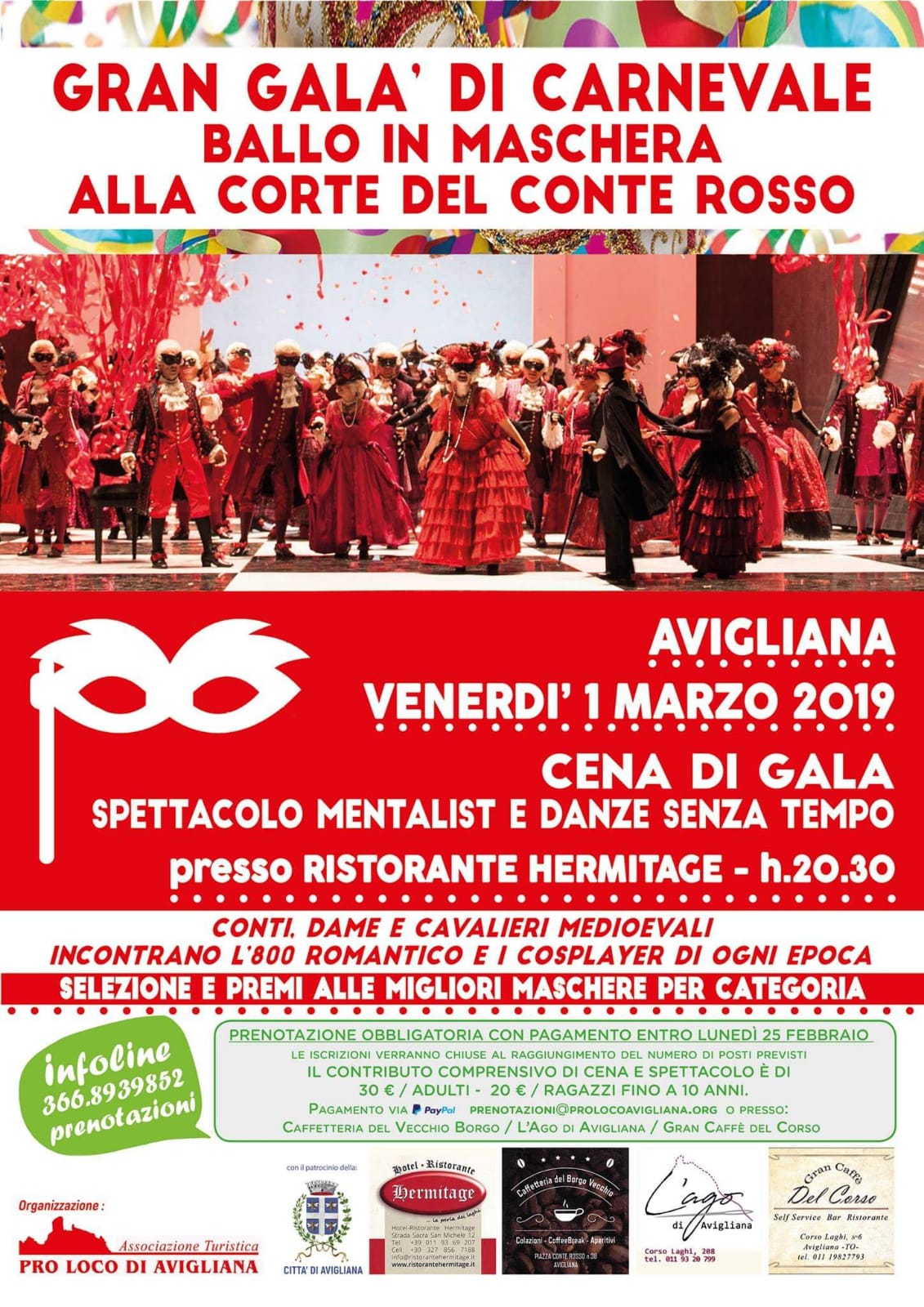 Gran gala di Carnevale, ballo in maschera alla corte del Conte Rosso: venerdì 1 marzo 2019 la Pro Loco di Avigliana organizza una serata al ristorante Hermitage con spettacoli e danze. Ci sarà una selezione e saranno consegnati premi alle migliori maschere.