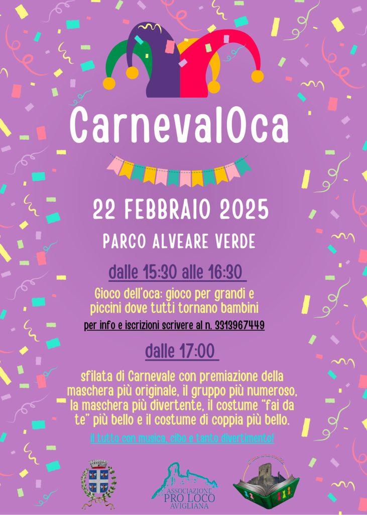 Avigliana, 19 febbraio 2025 – In occasione del Carnevale 2025, sabato 22 febbraio al parco Alveare verde la Pro loco di Avigliana ha organizzato “CarnevalOca“, un pomeriggio di gioco per grandi e piccini. Dalle 15,30 alle 16,30 si svolgerà il gioco dell’oca dove tutti tornano bambini. Per info e iscrizioni scrivere al numero 3313967449. Dalle 17 ci sarà poi la sfilata di Carnevale con premiazione della maschera più originale, del gruppo più numeroso, della maschera più divertente, del costume “fai da te” più bello e del costume di coppia più bello. Il tutto con musica, cibo e tanto divertimento. La manifestazione ha il patrocinio del Comune di Avigliana.