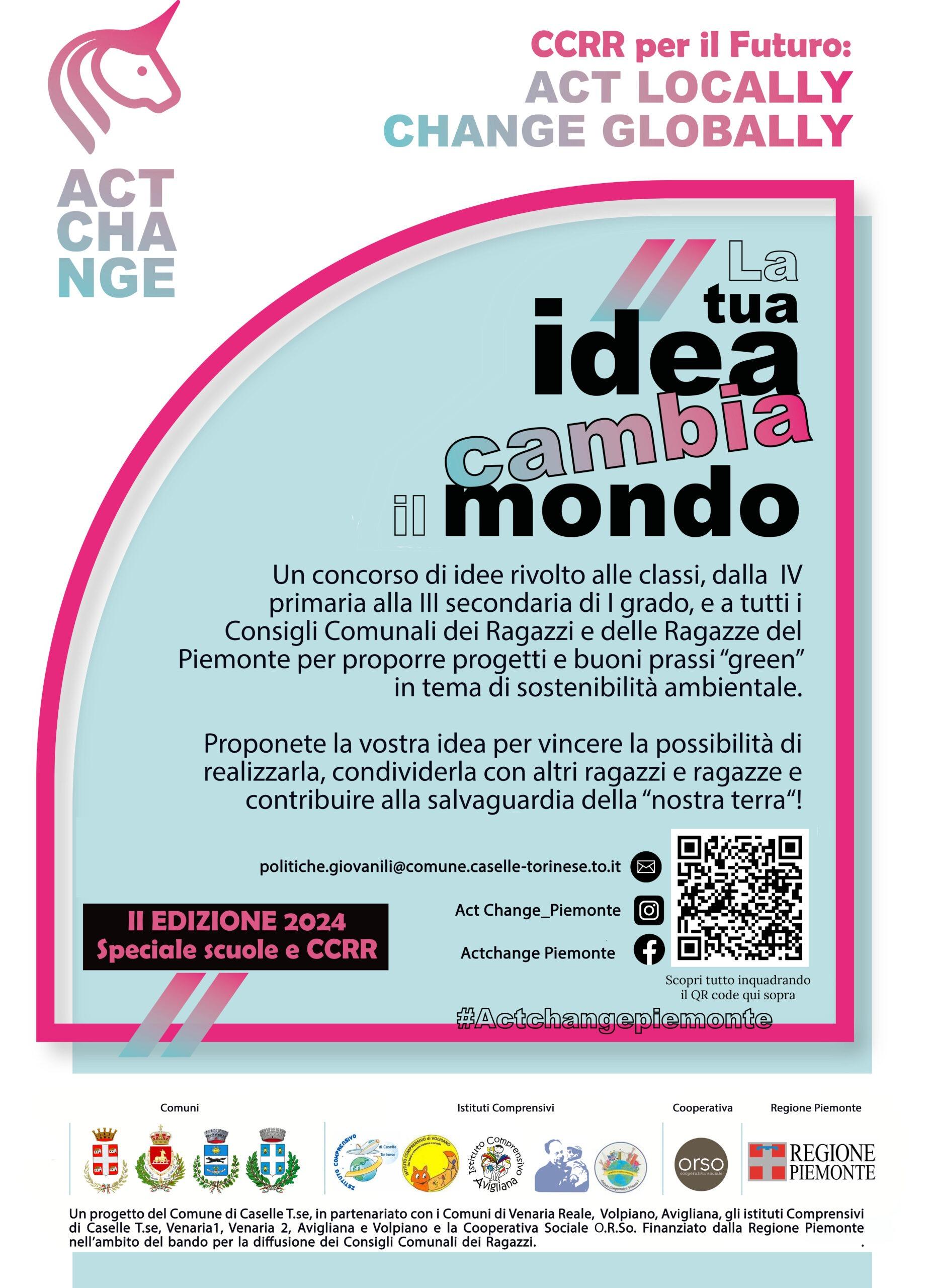 Avigliana, 29 aprile 2024 – Il Comune di Avigliana, nell’ambito del progetto Consiglio comunale dei ragazzi e delle ragazze, in partnership con i Comuni di Caselle Torinese (capofila), Venaria Reale, Volpiano, e i relativi Istituti comprensivi ha candidato ad un bando regionale il progetto “Ccrr per  il futuro: act locally, change globally”, un concorso di idee sul tema della sostenibilità ambientale.