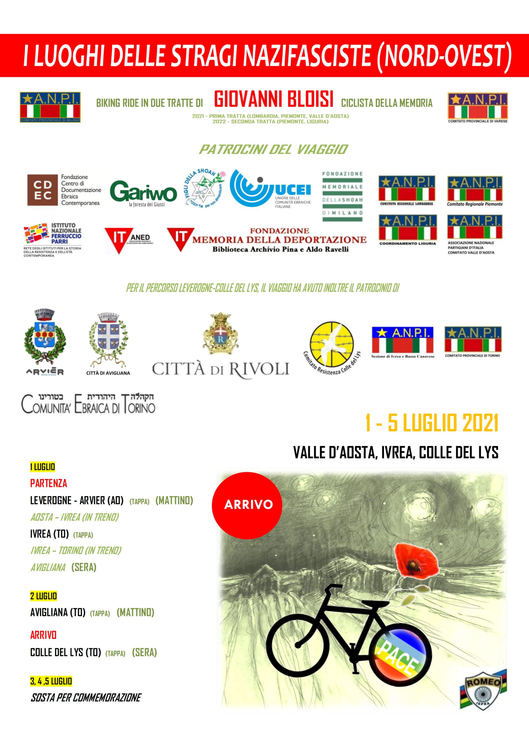 Il 1 luglio alle 21, prima della proiezione, è previsto l’incontro, organizzato in collaborazione con l’Anpi di Avigliana, con Giovanni Bloisi il ciclista della memoria. Il ciclista aveva in programma per il 2020 il Viaggio della Memoria “Le stragi nazifasciste”, poi sospeso, a causa dell’emergenza-coronavirus, e che è partito il 25 giugno di quest’anno. Il viaggio è ora suddiviso in due tratte: giugno 2021, Lombardia, province di Milano e Varese, Piemonte, province di Novara, Biella e Torino), Val d’Aosta. A giugno 2022 Piemonte, province Torino e Cuneo, Liguria.