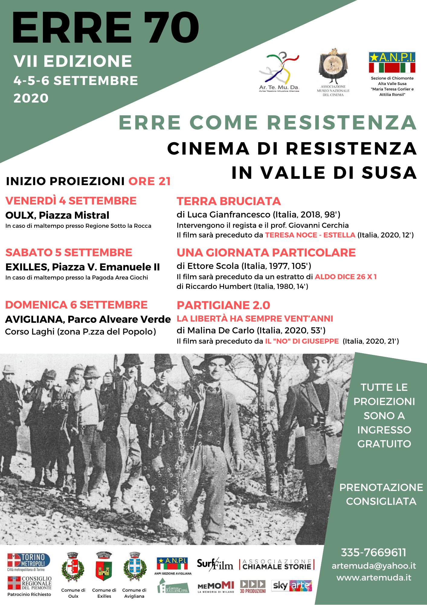 La rassegna cinematografica ERRE 70 – Cinema di Resistenza porta il cinema nei comuni della Valle di Susa su tematiche legate alla Resistenza partigiana. La rassegna, di solito organizzata nel mese di luglio, quest’anno ha subito ritardi a causa delle problematiche legate all’emergenza Coronavirus. L’evento in forma ridotta, è comunque organizzato per mantenere viva la memoria dei fatti legati alla Resistenza partigiana. La rassegna si svolgerà dal 4 al 6 settembre 2020 presso i comuni di Oulx, Exilles e Avigliana.