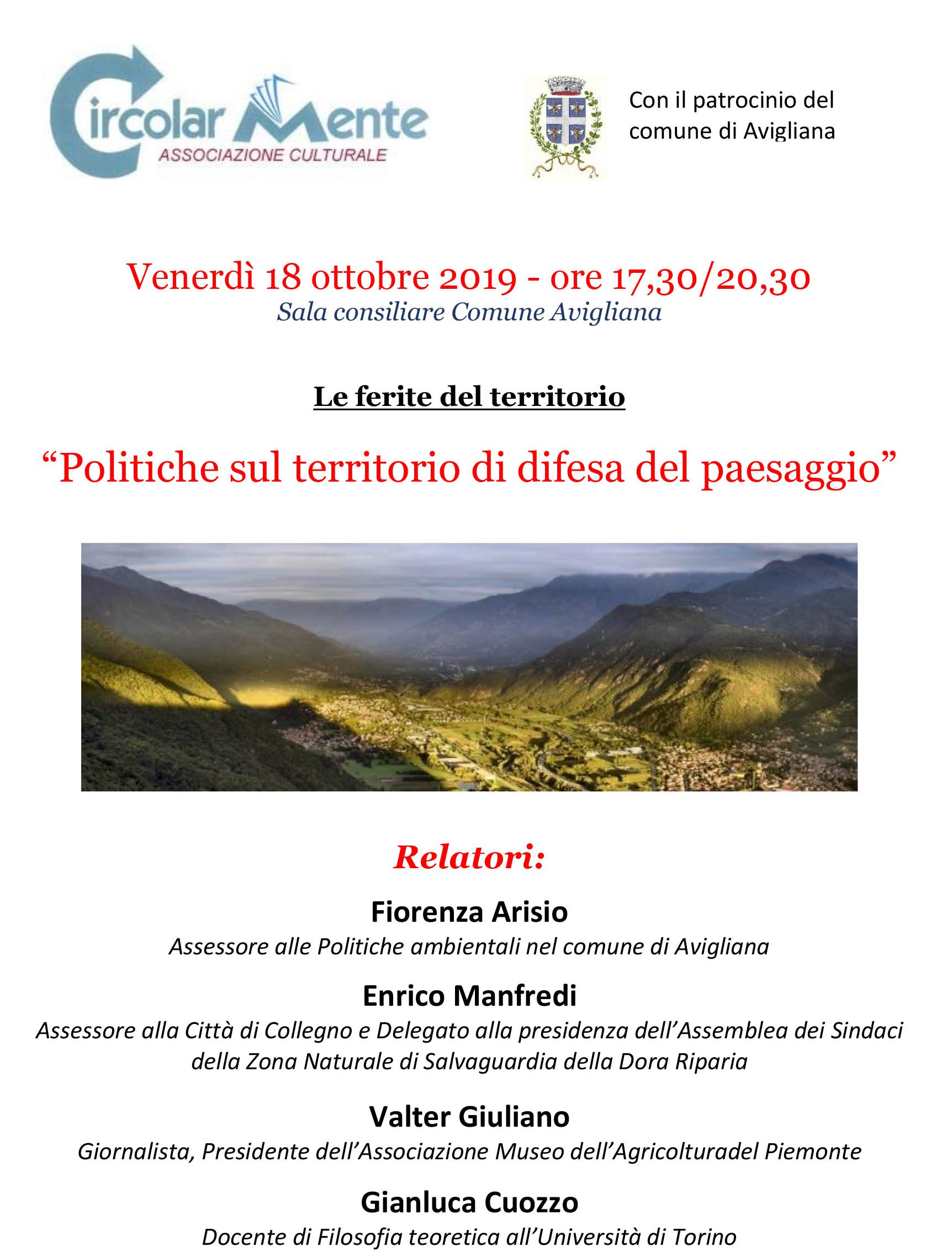Il primo incontro del programma, il 18 ottobre dalle 17,30 alle 20,30 in sala consiliare di Avigliana, ci porterà alle ferite forse più evidenti, quelle che uno sguardo sensibile riconosce ogni giorno: le ferite al territorio. In apertura ascolteremo una storia di successo: l’iniziativa che nove Città toccate dal nostro dimenticato fiume, la Dora Riparia, hanno sviluppato per ricucire in un progetto comune alcuni frammenti significativi delle sue sponde e per dare loro, per quanto possibile, dignità ambientale e fruibilità sociale. Gli Assessori Fiorenza Arisio e Enrico Manfredi, responsabili delle politiche ambientali di Avigliana e di Collegno ci spiegheranno i punti salienti del progetto della Zona di salvaguardia della Dora Riparia.