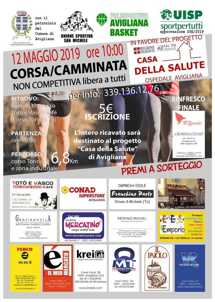 Sono stati 400 i partecipanti alla corsa non competitiva dedicata ai camminatori e ai corridori che si è svolta il 12 maggio scorso ad Avigliana, lungo corso Torino verso la zona industriale, in un percorso di 6,8km. La corsa è stata organizzata da Unione sportiva San Michele, di cui Paolo Rucchione è uno dei promotori e organizzatore, dalla Polisportiva Avigliana Basket e dall’Uisp. L’iscrizione aveva un costo di 5 euro e il ricavato di circa 2000 euro è stato devoluto alla Casa della salute di Avigliana. La corsa ha ottenuto il patrocinio del Comune di Avigliana, assessorato allo Sport.