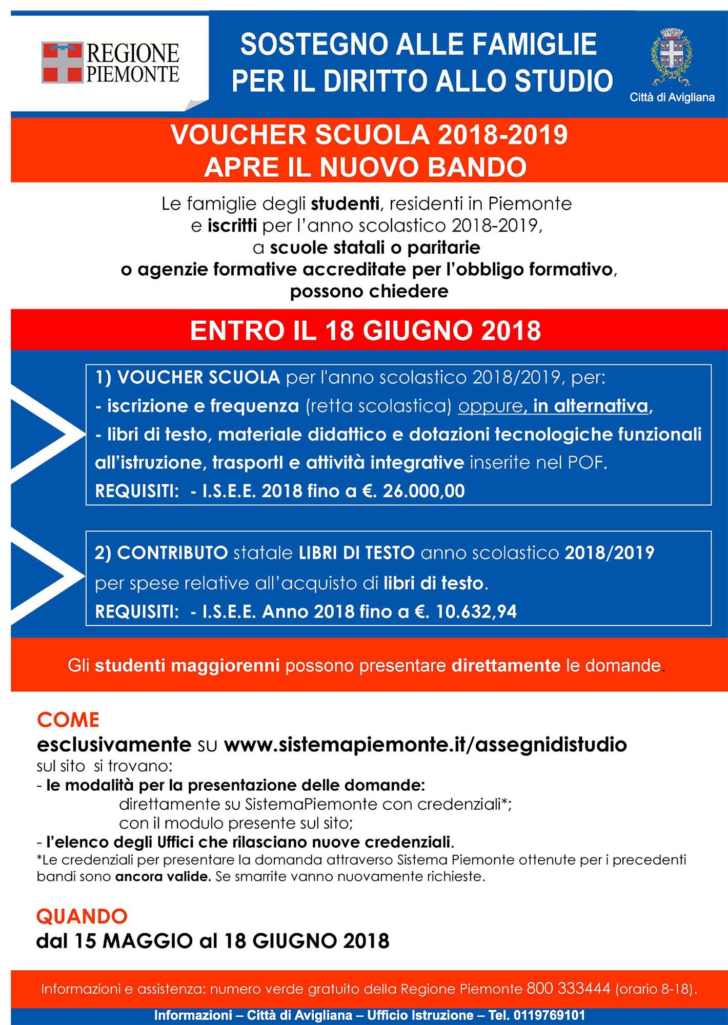 Le famiglie degli studenti piemontesi iscritti all’anno scolastico 2018/2019 possono presentare un’unica domanda per gli aiuti economici alle famiglie per il diritto allo studio, finanziati con risorse regionali e statali. Anche per quest’anno è confermato l’utilizzo del voucher elettronico, il cui valore è determinato sulla base della situazione Isee anno 2018, per spese di iscrizione e frequenza (retta scolastica) oppure, in alternativa, per spese relative a libri di testo, trasporto e attività integrative (inserite nel Pof). Al fine di consentire alle famiglie non ancora in possesso dell’attestazione Isee 2018 di poter presentare comunque la domanda, l’Amministrazione regionale acquisirà direttamente dalla banca dati Inps le dichiarazioni Isee valide alla data del 30 giugno.