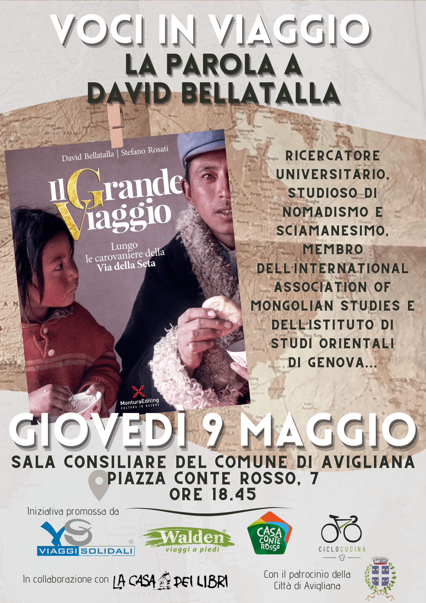Avigliana, 3 maggio 2024 – Giovedì 9 maggio 2024 alle 18,45 in Sala Consiglio comunale  David Bellatalla, antropologo, ricercatore universitario e studioso di nomadismo e sciamanesimo nonché ambasciatore culturale per il Ministero degli Esteri della Mongolia e membro dell’International association of Mongolian studies e dell’Istituto di Studi orientali di Genova, è il protagonista del secondo appuntamento della rassegna Voci in viaggio promossa da Viaggi solidali, Walden, Casa Conte Rosso e Ciclocucina, in collaborazione con la libreria La Casa dei Libri, e patrocinata dalla Città di Avigliana.