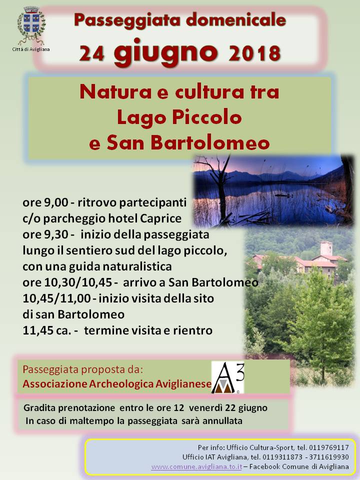 Una guida naturalistica accompagna i partecipanti alla passeggiata domenicale prevista il 24 giugno dalle 9 alle 11,45. La passeggiata inizia alle 9,30 lungo il sentiero Sud del lago piccolo. Si arriva poi a San Bartolomeo e si visiterà il borgo. Rientro previsto alle 11,45 circa. La passeggiata è proposta dall’Associazione archeologica aviglianese. Gradita la prenotazione entro le ore 12 di venerdì 22 giugno. In caso di maltempo l’evento sarà annullato.