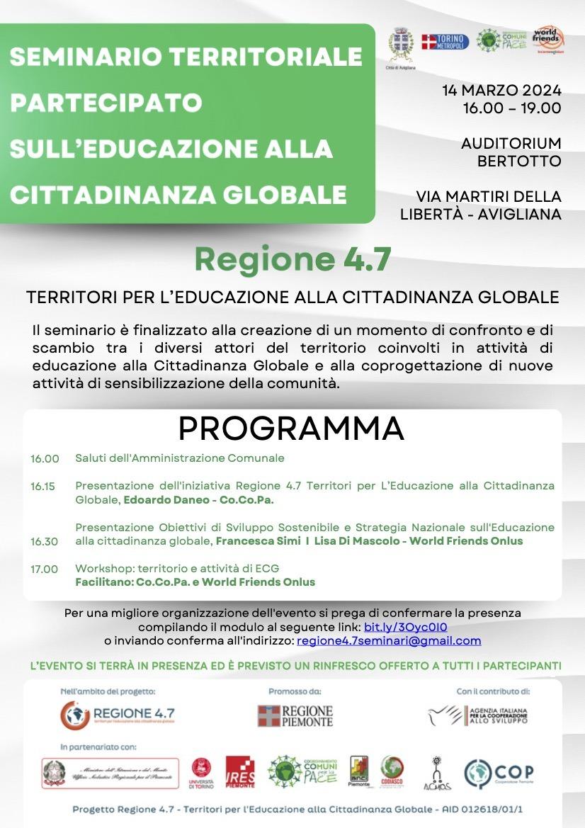 Avigliana, 7 marzo 2024 – Il seminario territoriale partecipato che si svolge ad Avigliana sull’Educazione alla cittadinanza globale il 14 marzo 2024 dalle 16 alle 19 all’auditorium Bertotto è un’iniziativa promossa dalla Regione Piemonte, in partenariato con Città metropolitana di Torino e altre realtà del terzo settore, nell’ambito del progetto Regione 4.7 di cui il nostro Comune è partner.