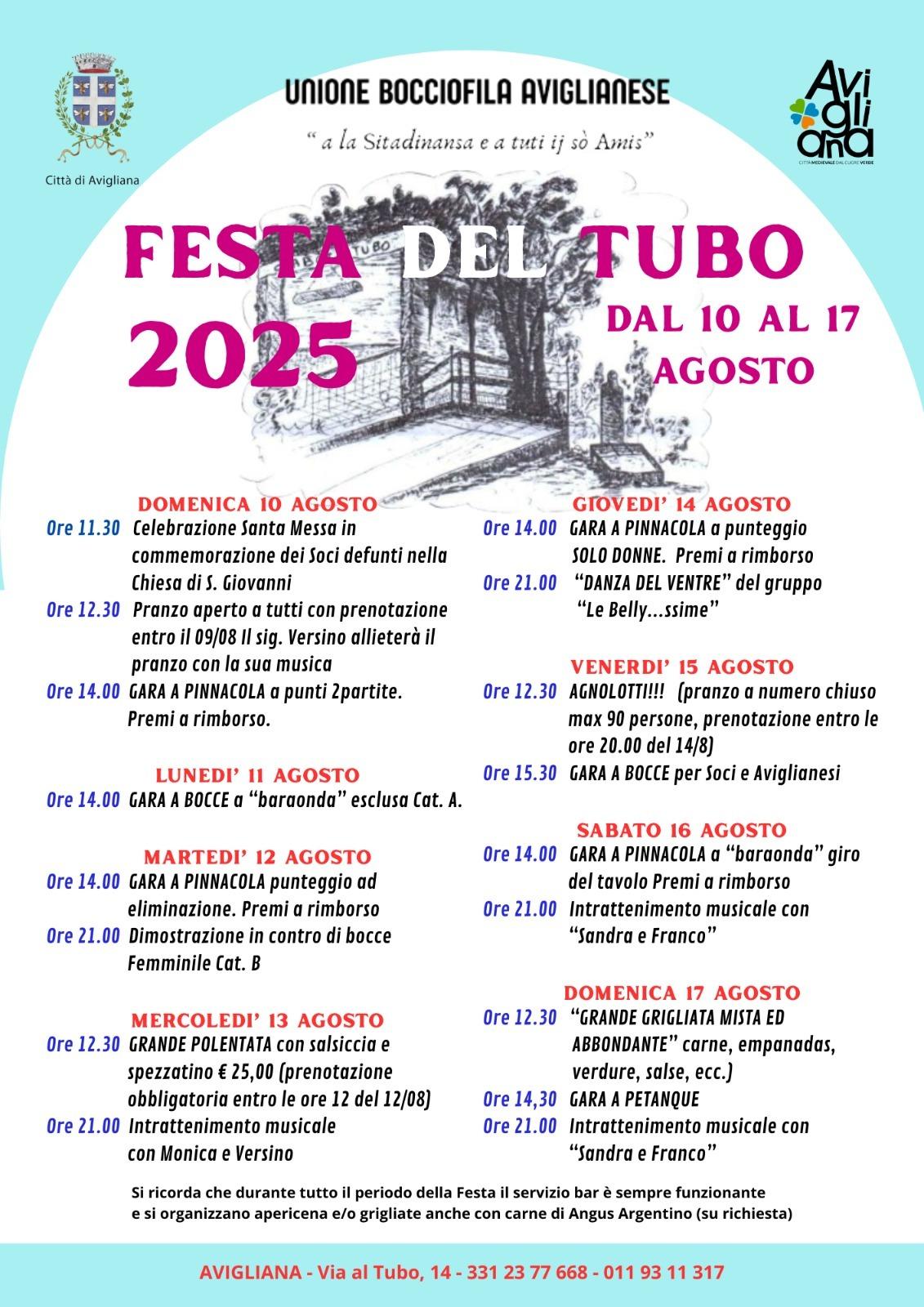 Avigliana, 31 luglio 2025 – L’Unione bocciofila aviglianese organizza con il patrocinio del Comune di Avigliana la Festa del Tubo che si svolge come da tradizione nella settimana di Ferragosto, da domenica 10 a domenica 17 agosto 2025. L’evento prevede pranzi all’aperto, gare di bocce e di petanque, gare di pinnacola, musica e danze.