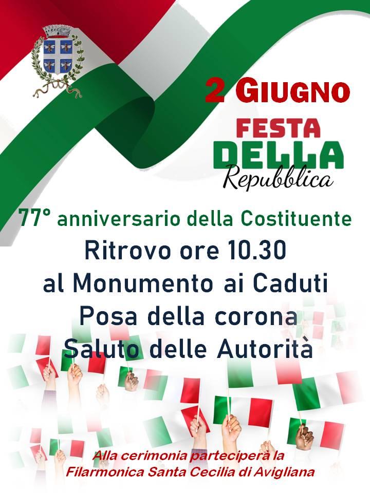 Avigliana, 30 maggio 2023 – Il 2 giugno prossimo si celebra il 77esimo anniversario della Costituente. In occasione della Festa della Repubblica la cerimonia si svolgerà al Monumento dei Caduti con ritrovo alle 10,30, posa della corona e saluto delle autorità. Parteciperà la Filarmonica Santa Cecilia di Avigliana.