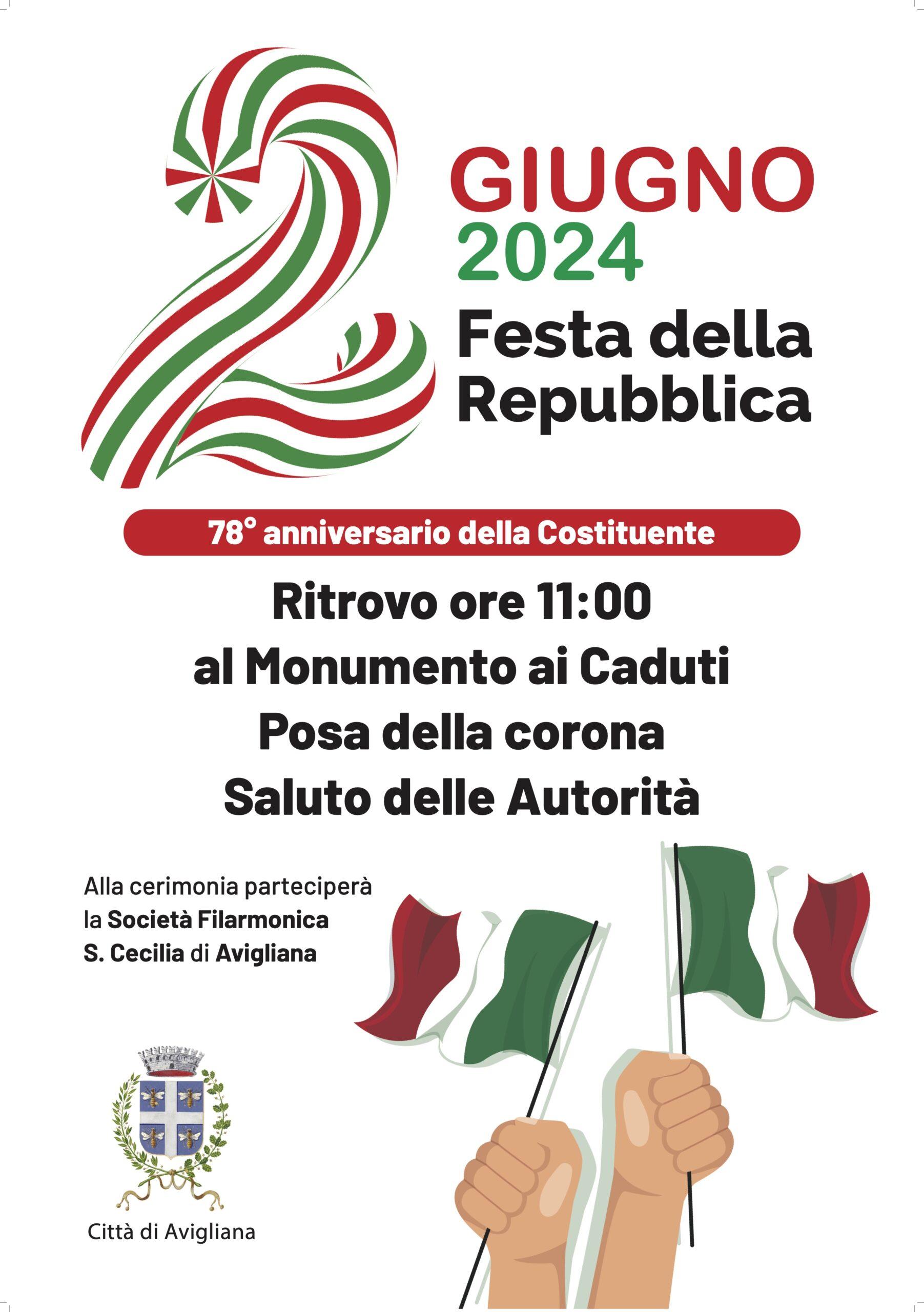 Avigliana, 31 maggio 2024 – Domenica 2 giugno 2024 si celebra la Festa della Repubblica. L’appuntamento con le celebrazioni per il 78esimo anniversario della Costituente è alle 11 al Monumento ai Caduti per la posa della corona e il saluto delle autorità. Alla cerimonia parteciperà la Società filarmonica Santa Cecilia di Avigliana.