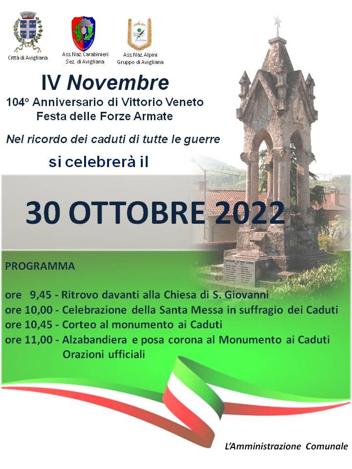 La Città di Avigliana insieme all’Associazione nazionale Carabinieri sezione di Avigliana, all’Associazione nazionale Alpini gruppo di Avigliana, domenica 30 ottobre 2022 ha celebrato il 104esimo anniversario di Vittorio Veneto e il Giorno dell’Unità nazionale nel ricordo dei caduti di tutte le guerre.