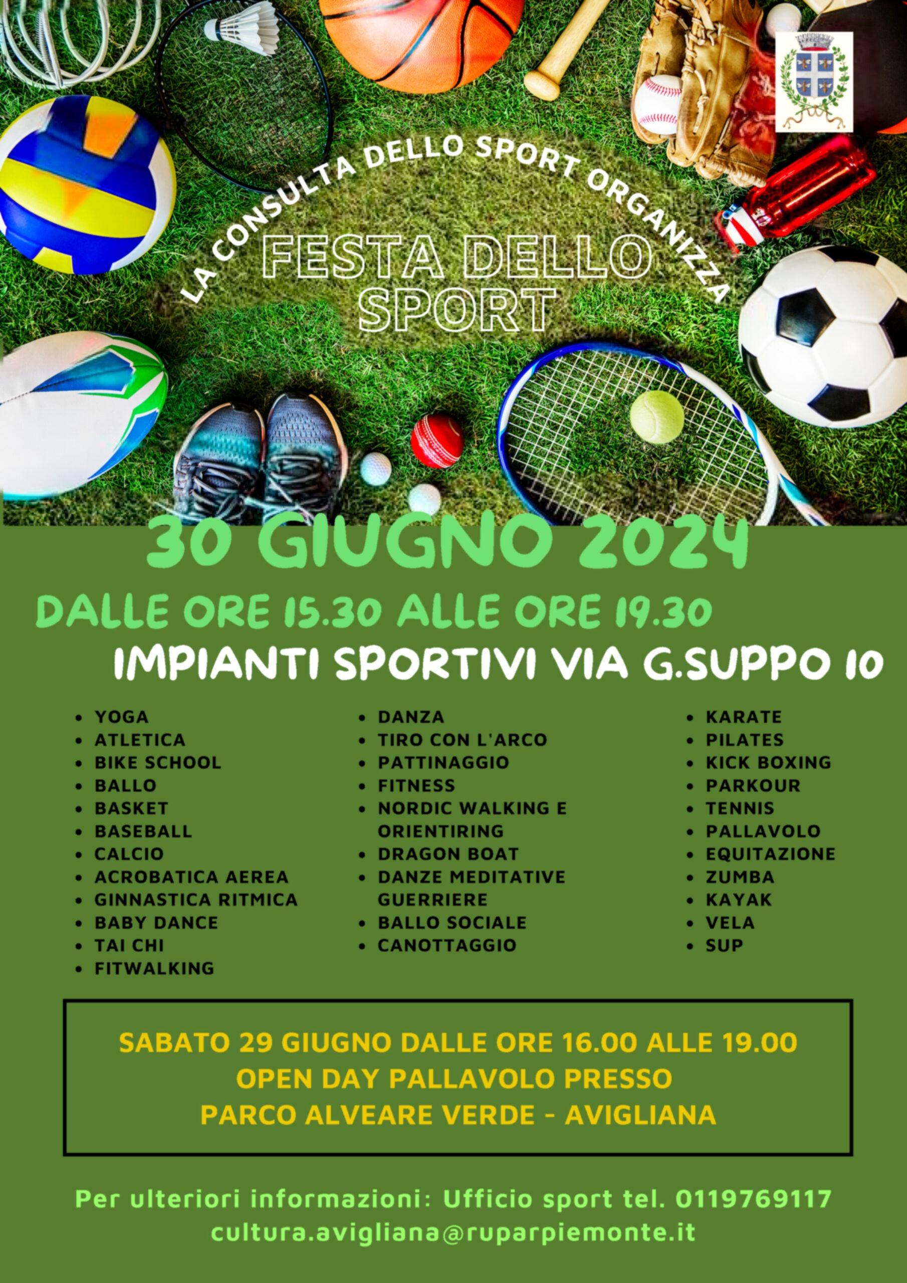 Avigliana, 20 giugno 2024 – Dalle 15,30 alle 19,30 di domenica 30 giugno 2024 agli impianti sportivi di via Suppo 10 la Consulta dello Sport organizza la Festa dello Sport in collaborazione con l’assessorato allo Sport del Comune di Avigliana che ha patrocinato l’iniziativa. Sarà possibile assistere a dimostrazioni ed esibizioni sportive ma anche provare, partecipare e giocare nell’arco di tutta la giornata con le proposte delle associazioni sportive presenti.