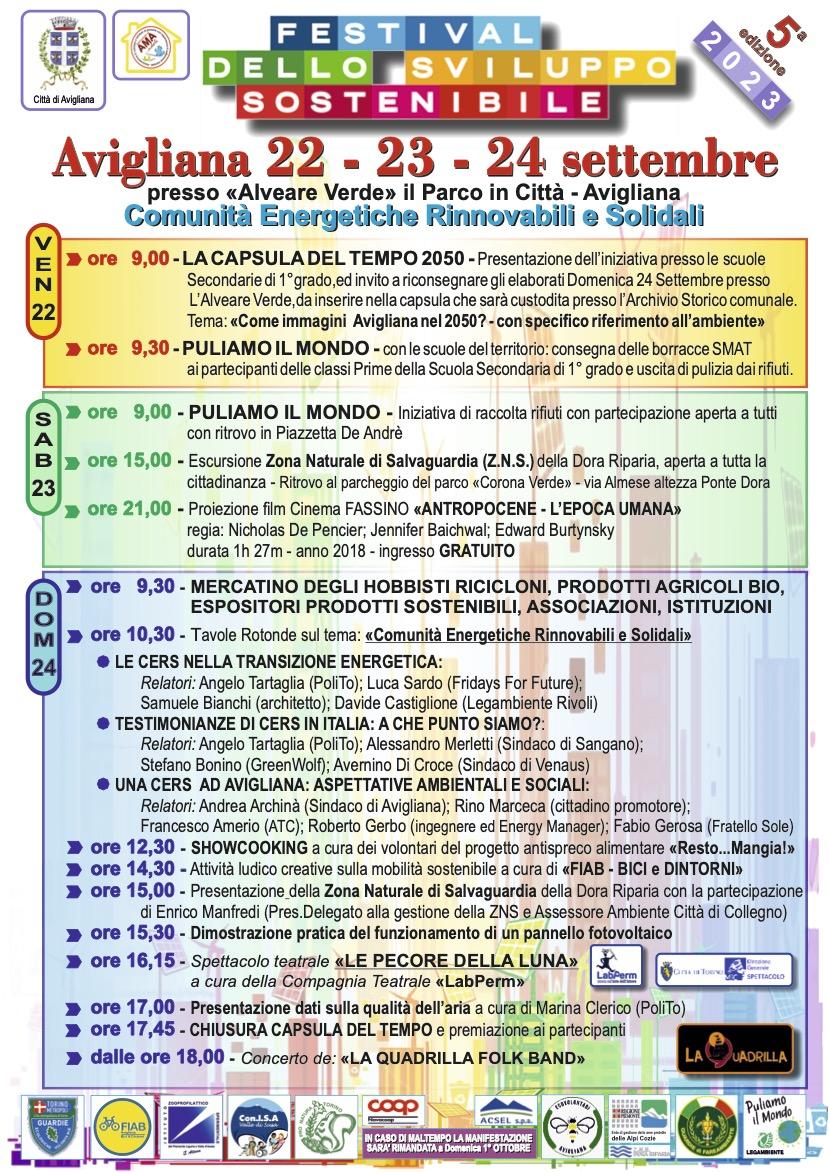 Avigliana, 15 settembre 2023 – Da 5 anni ad Avigliana nel mese di settembre si svolge il Festival dello Sviluppo sostenibile, organizzato dall’assessorato all’Ambiente del Comune e dall’associazione Amandoli in collaborazione con le Guardie ecologiche volontarie della Città metropolitana, Fiab, Istituto Zooprofilattico Sperimentale del Piemonte Liguria e Valle d’Aosta, Conisa, Pro Natura Torino, Coop, Acsel Spa, Ecovolontari Avigliana, Ente di gestione dei parchi delle Alpi Cozie, Guardie di Fareambiente, Legambiente.