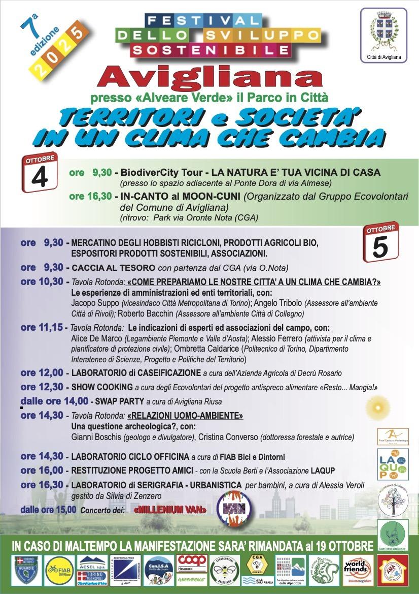 Avigliana, 26 settembre 2025 – “Territori e società in un clima che cambia” è il tema del Festival dello Sviluppo sostenibile di quest’anno, giunto alla sua settima edizione. Come ogni anno, il festival si svolge al parco Alveare verde di Avigliana ed è organizzato dall’assessorato all’Ambiente del Comune e dall’associazione Amandoli in collaborazione con Ecovolontari Avigliana, Guardie ecologiche volontarie della Città metropolitana, Città Metropolitana di Torino, Acsel Spa, Fiab bici e dintorni, Istituto Zooprofilattico sperimentale del Piemonte Liguria e Valle d’Aosta, Conisa, Pro natura Torino, Coop, World friends, Ente di gestione dei parchi delle Alpi Cozie, Guardie ecozoofile di Fareambiente, Greenpeace, Ara Arte restauro archeologia e Silvia di Zenzero.