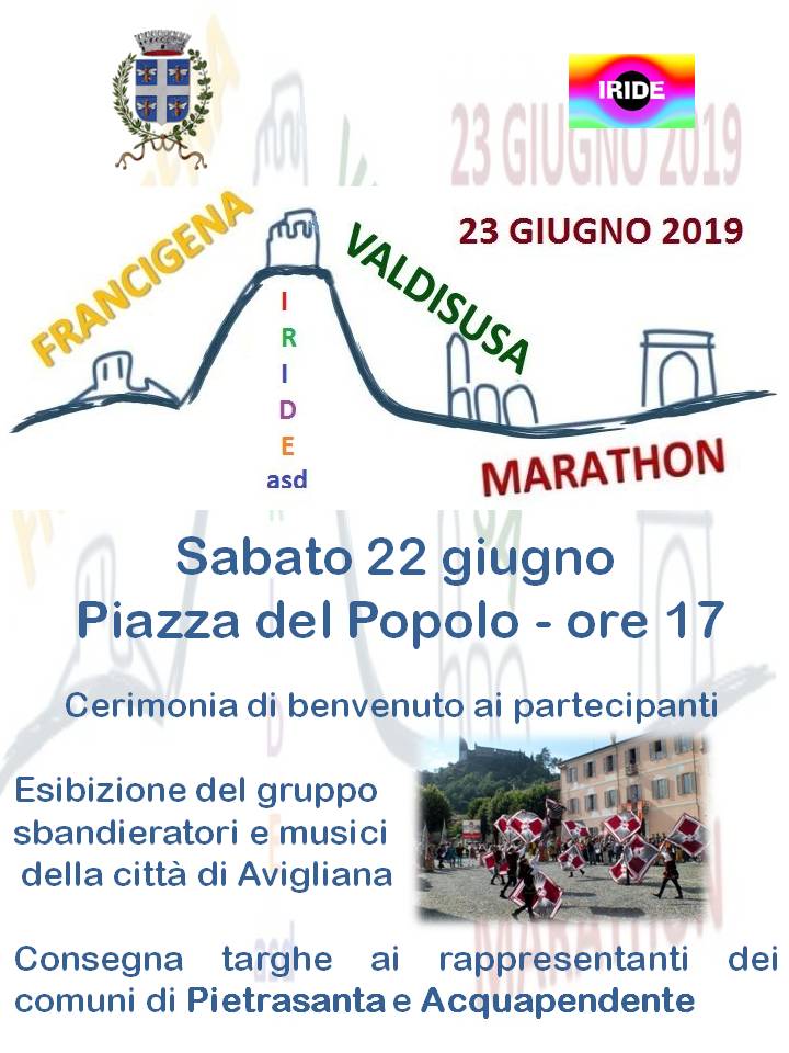 È stata una manifestazione completamente ecosostenibile la seconda edizione della Francigena Valdisusa Marathon 2019 che si è svolta il 23 giugno 2019. Suddivisa in Marathon (42 km), Half marathon (21 km), Family (10km), Easy (21km in pianura) e Wheeled (dedicata ai paraplegici, faranno ko stesso percorso della Easy). Sold out con 3000 iscritti, oltre 700 in più dello scorso anno.