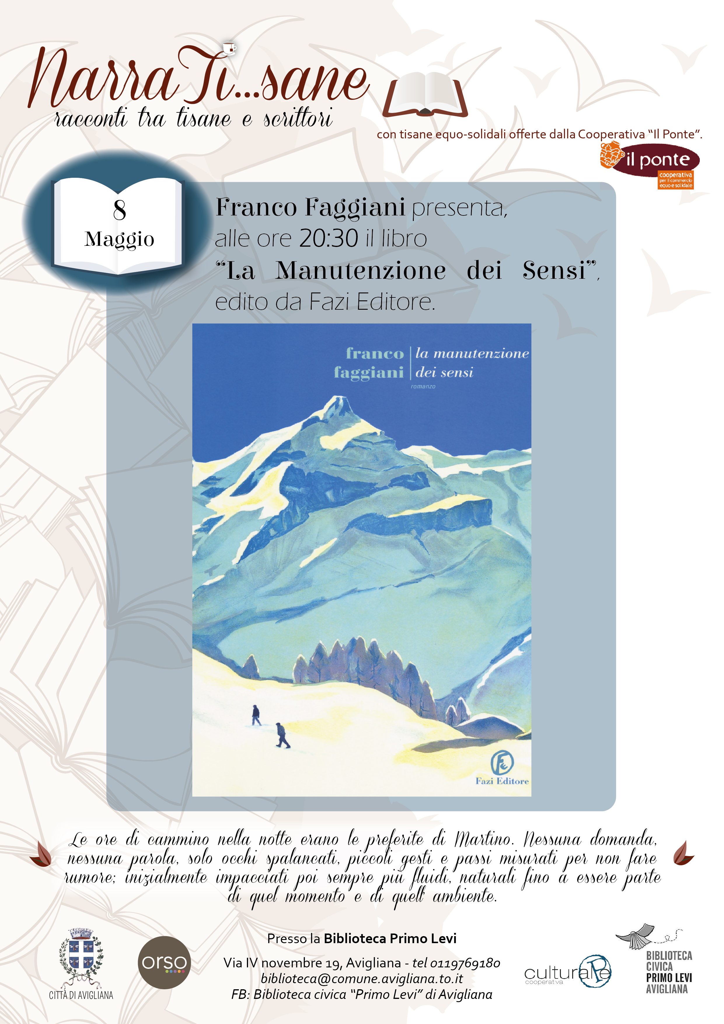 Mercoledì 8 maggio alla biblioteca Primo Levi di Avigliana si terrà un incontro con lo scrittore Franco Faggiani nell’ambito della rassegna Narra Ti…sane Franco Faggiani vive a Milano e fa il giornalista. Ha lavorato come reporter nelle aree più calde del mondo. Si è occupato di economia, ambiente, cronaca, sport e, negli ultimi anni, di enogastronomia. Ha scritto manuali sportivi, guide, biografie, saggi e testi di libri fotografici. Da sempre alterna alla scrittura lunghe e solitarie esplorazioni in montagna.
