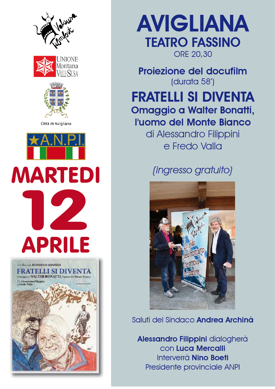 Valsusafilmfest: "Fratelli si diventa"Sarà proiettato anche al teatro Fassino martedì 12 aprile 2022 alle 20,30 il docufilm “Fratelli si diventa. Omaggio a Walter Bonatti l’uomo del Monte Bianco”, con la regia di Alessandro Filippini e Fredo Valla (durata 58 minuti). Dopo i saluti del sindaco di Avigliana Andrea Archinà, in sala Alessandro Filippini introdurrà il film dialogando con Luca Mercalli. Sarà presente anche Nino Boeti presidente provinciale Anpi, che premierà le “Donne forti” allevatrici della Valle di Susa. L’incontro del Valsusa Filmfest in collaborazione con Anpi è patrocinato da Comune di Avigliana e Unione Montana Valle Susa.