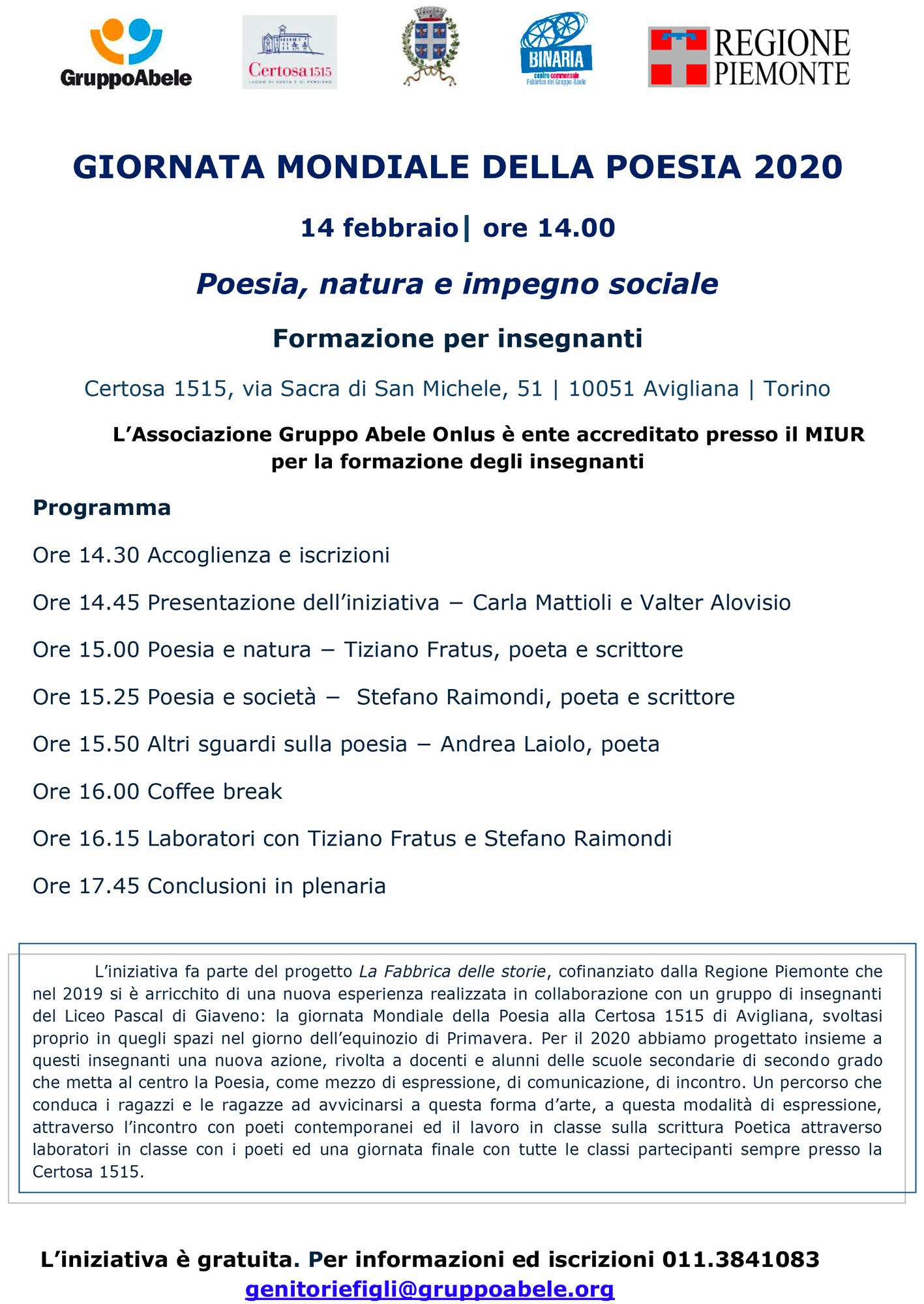 “Poesia, natura e impegno sociale”: l’iniziativa fa parte del progetto La Fabbrica delle storie, cofinanziato dalla Regione Piemonte che nel 2019 si è arricchito di una nuova esperienza realizzata in collaborazione con un gruppo di insegnanti del Liceo Pascal di Giaveno: la Giornata Mondiale della Poesia alla Certosa 1515 di Avigliana, svoltasi proprio in quegli spazi nel giorno dell’equinozio di Primavera.