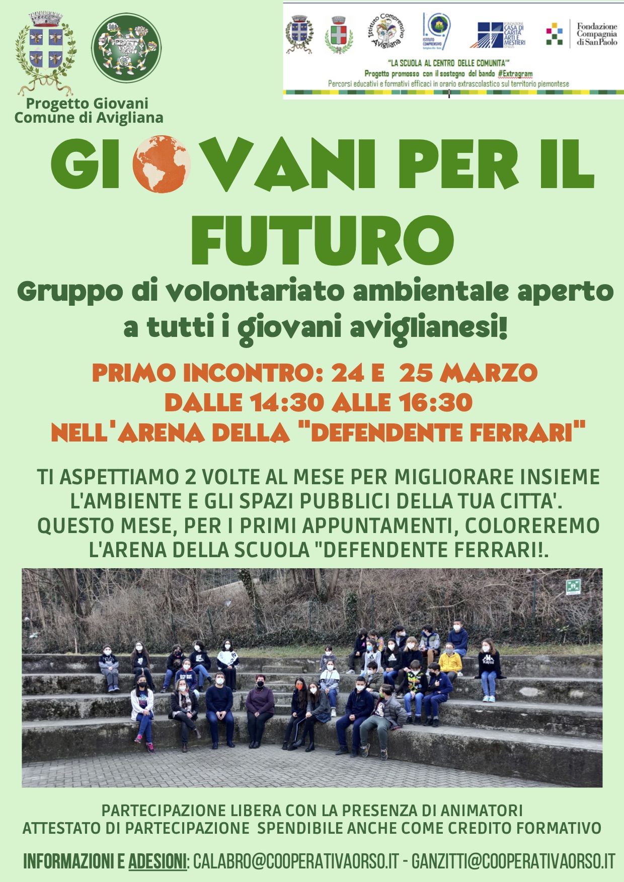 Nell’arena della scuola media Defendente Ferrari si terranno gli incontri del Gruppo di volontariato ambientale Giovani per il futuro, aperto a tutti i giovani aviglianesi. Gli incontri si terranno due volte al mese per migliorare insieme l’ambiente e gli spazi pubblici della città. «Questo mese – spiegano gli organizzatori della cooperativa Orso – per i primi appuntamenti, coloreremo l’arena della scuola Defendente Ferrari». La partecipazione è libera con la presenza di animatori. Ci sarà un attestato di partecipazione spendibile anche come credito formativo.