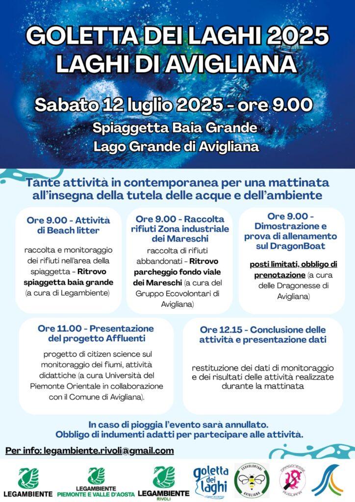 Sabato 12 luglio giornata conclusiva ad Avigliana. Dalle 9 è prevista un’attività di monitoraggio e raccolta rifiuti presso la spiaggetta Baia grande del Lago Grande di Avigliana a cura di Legambiente. In contemporanea, presso l’area Mareschi, sarà svolta un’attività di pulizia della zona industriale a cura degli Ecovolontari di Avigliana e una dimostrazione in Dragon boat dell’associazione Dragonesse. Alle 11, sempre presso la spiaggetta, la presentazione del progetto di citizen science Affluenti incentrato sul monitoraggio della microfauna fluviale e, a seguire, dalle 12,15 la presentazione dei risultati dei campionamenti microbiologici della Goletta dei Laghi sui Laghi di Avigliana.