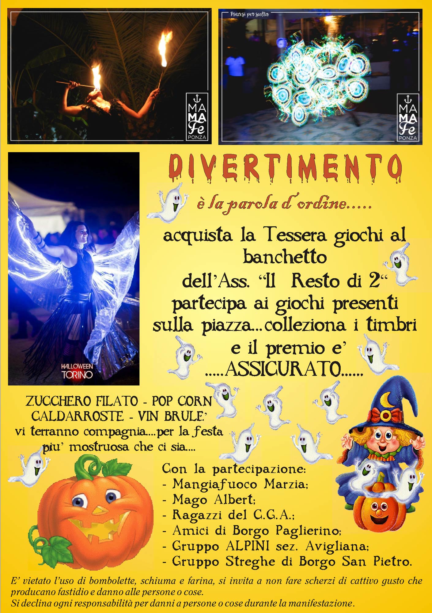 La manifestazione si svolge dalle ore 21 in avanti. Alla festa partecipano i tre borghi di Avigliana (Paglierino, Pertusera e San Pietro) con i loro emblemi che ben si adattano ad Halloween. San Pietro è infatti conosciuto per le sue streghe, Pertusera per il boia e Borgo Paglierino è invece presente con un emblema a sorpresa. In piazza Conte Rosso, montato un finto cimitero e un labirinto. La presenza della sezione Alpini di Avigliana allieterà i partecipanti con vin brûlé e caldarroste.