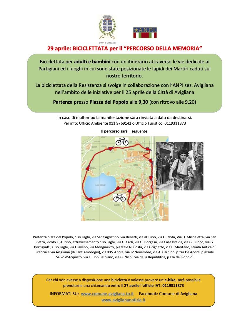 Lunedì 24 aprile alle 20 si svolgerà la Camminata di Valle con partenza da piazza Matteotti a Caprie e arrivo in piazza Martiri della libertà a Condove. L’ultimo evento è la biciclettata “Percorso della memoria” per adulti e bambini con un itinerario attraverso le vie dedicate ai partigiani e i luoghi in cui sono state posizionate le lapidi dei martiri caduti sul territorio sabato 29 aprile alle 9,30 con partenza da piazza del Popolo.