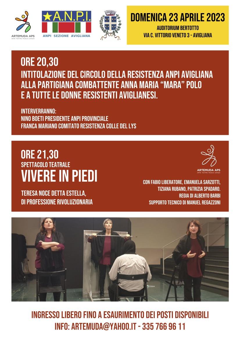 A seguire sarà inaugurata la targa commemorativa del Circolo della Resistenza Anpi Avigliana alla partigiana combattente Anna Maria “Mara” Polo, con un rinfresco offerto dall’Anpi nel cortile della Società Operaia in via Montenero e l’accompagnamento musicale della Filarmonica Santa Cecilia di Avigliana. Il Circolo della Resistenza Anpi Avigliana sarà infatti intitolato alla partigiana “Mara” già domenica 23 aprile con una cerimonia all’auditorium Daniele Bertotto alle 20,30: interverranno Nino Boeti, presidente Anpi provinciale e Franca Mariano del Comitato Resistenza Colle Lys. Alle 21,30 di domenica 23 andrà in scena lo spettacolo teatrale “Vivere in piedi – Teresa Noce detta Estella di professione rivoluzionaria” con la regia di Alberto Barbi, a cura dell’associazione Artemuda.