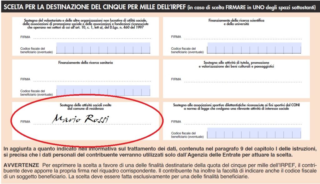 Il 5×1000 infatti non è un’imposta aggiuntiva e non è sostitutiva dell’8×1000 dell’Irpef destinato allo Stato o alle confessioni religiose. Consente ai cittadini di destinare una parte delle imposte dovute a sostegno delle azioni e degli interventi sociali della propria città.