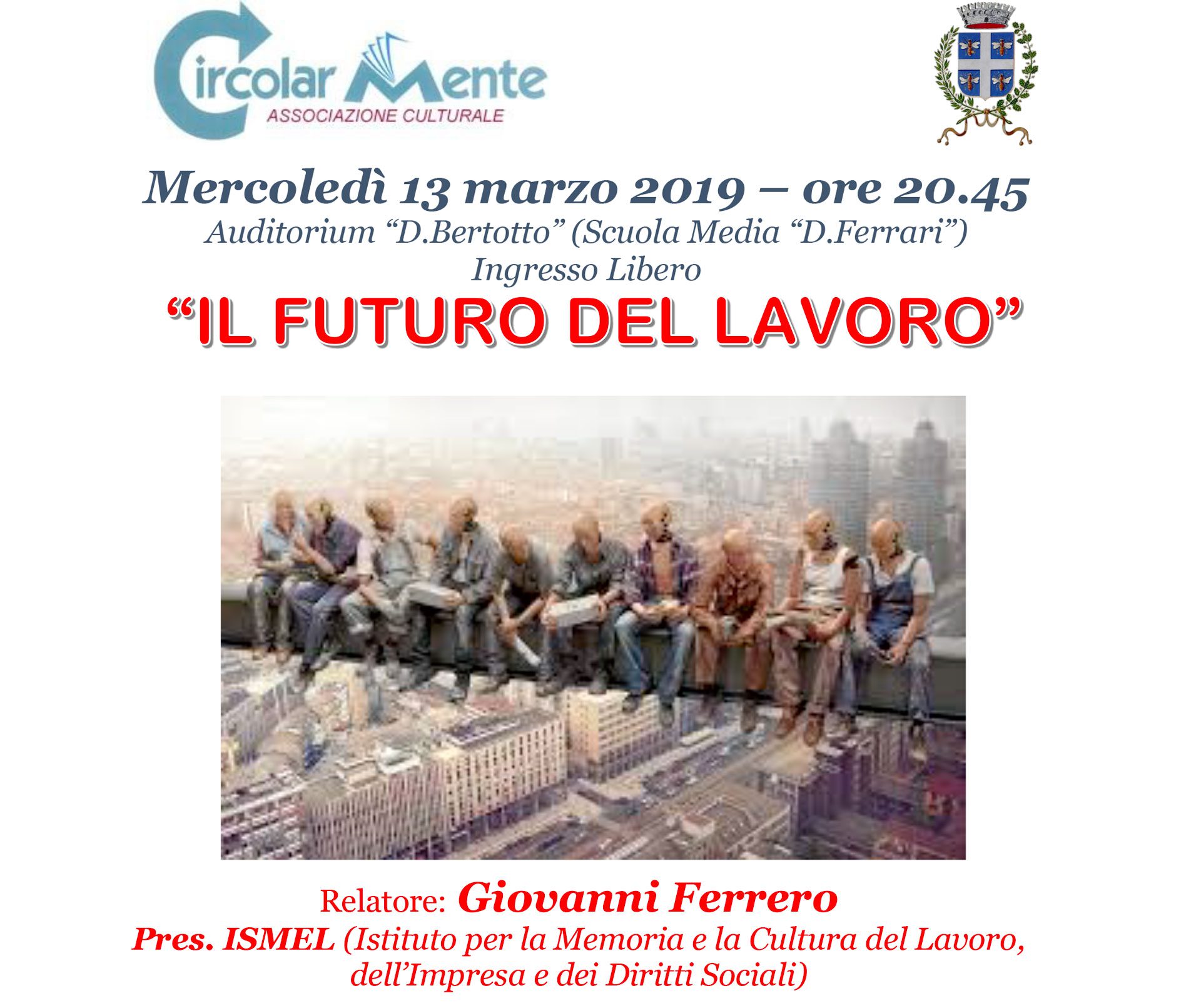L’associazione Circolarmente affronta il tema del lavoro nell’incontro di mercoledì 13 marzo 2019 all’Auditorium Daniele Bertotto alle ore 20,45. Relatore il professor Giovanni Ferrero