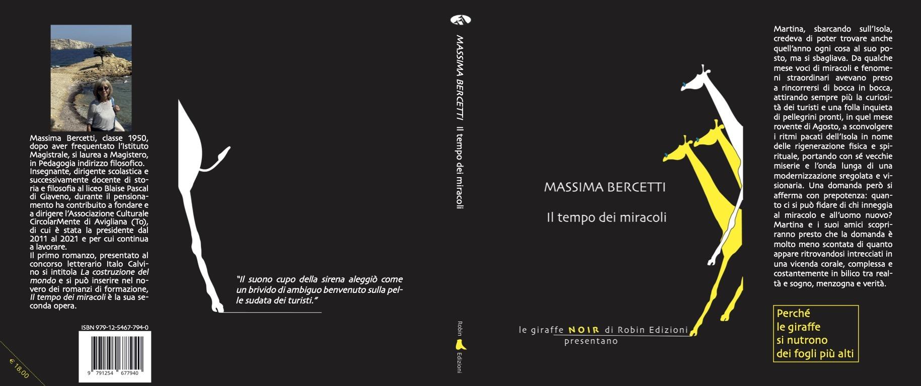 Massima Bercetti, aviglianese classe 1950, dopo aver frequentato l’Istituto Magistrale, si laurea a Magistero, in Pedagogia indirizzo filosofico. Insegnante, dirigente scolastica e successivamente docente di storia e filosofia al liceo Blaise Pascal di Giaveno, durante il pensionamento ha contribuito a fondare e a dirigere l’associazione culturale Circolarmente di Avigliana, di cui è stata la presidente dal 2011 al 2021 e per cui continua a lavorare. Il primo romanzo, presentato al concorso letterario Italo Calvino si intitola “La costruzione del mondo” e si può inserire nel novero dei romanzi di formazione. Il tempo dei miracoli è la sua seconda opera.