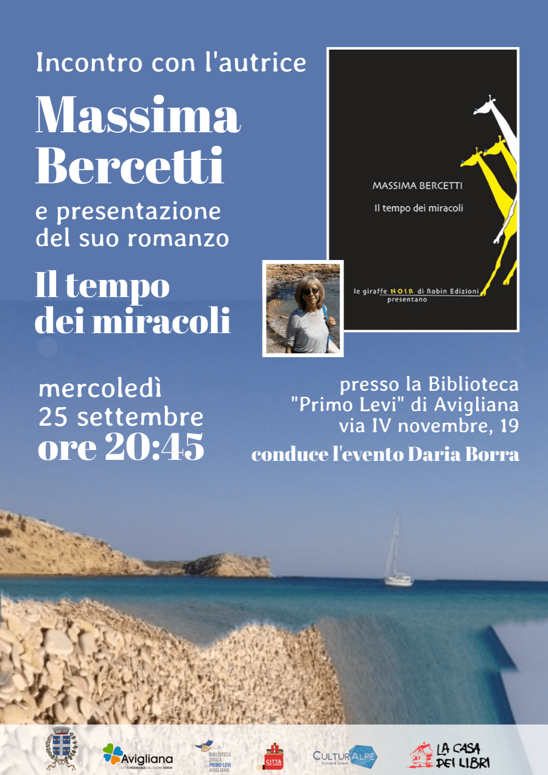 Mercoledì 25 settembre 2024 alla biblioteca civica Primo Levi di Avigliana Massima Bercetti presenta il suo secondo romanzo “Il tempo dei miracoli” intervistata da Daria Borra