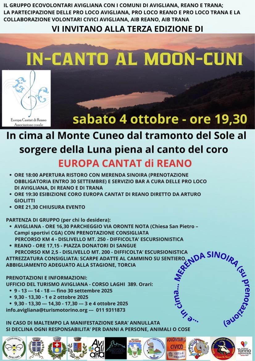 Avigliana, 22 settembre 2025 – Dopo il successo delle due precedenti edizioni, nella magnifica cornice del Monte Cuneo, da cui si può godere della vista panoramica sui due laghi di Avigliana, sabato 4 ottobre alle 19,30 si svolge la terza edizione di In-canto al Moon-cuni, organizzata dal gruppo Ecovolontari Avigliana con i Comuni di Avigliana, Reano e Trana insieme alle rispettive Pro loco e in collaborazione con i Volontari civici Avigliana, Aib Reano, Aib Trana.