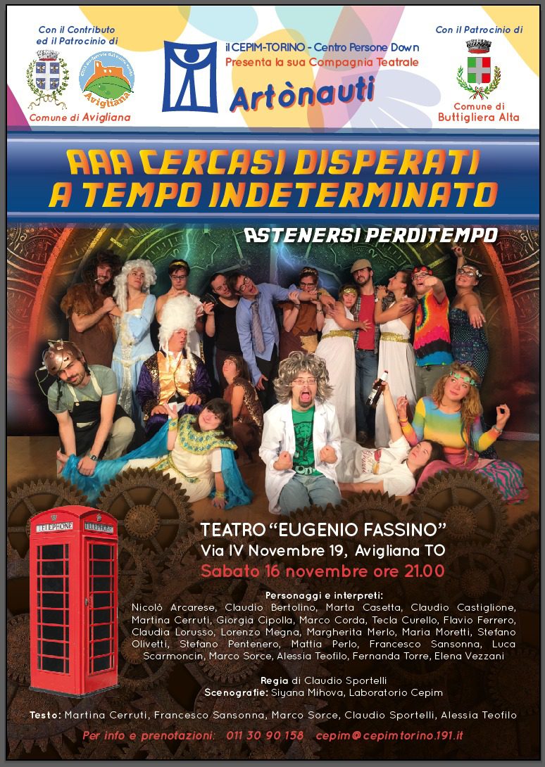 Il 16 novembre alle 21 il Teatro Eugenio Fassino vedrà in scena la compagnia teatrale del Cepim-Torino Centro persone down con lo spettacolo “AAA Cercasi disperati a tempo indeterminato”.
