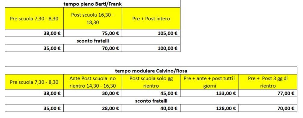 Come già annunciato nelle precedenti comunicazioni, questo servizio partirà con almeno 10 iscrizioni per tipologia di servizio richiesto e per plesso scolastico. Se sarà raggiunto il numero di iscrizioni utile per l’avvio, il servizio si svolgerà a partire dal 17 settembre. Il servizio sarà erogato dalla cooperativa Start e i costi sono indicati nella tabella seguente: