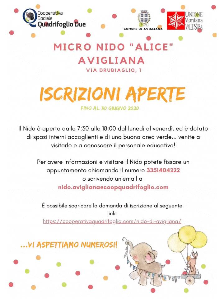 Il micronido Alice, gestito dalla Cooperativa sociale Quadrifoglio, si trova in via Drubiaglio 1 ad Avigliana (TO). La domanda di iscrizione può essere scaricata da qui e inviata entro il 30 giugno 2020.